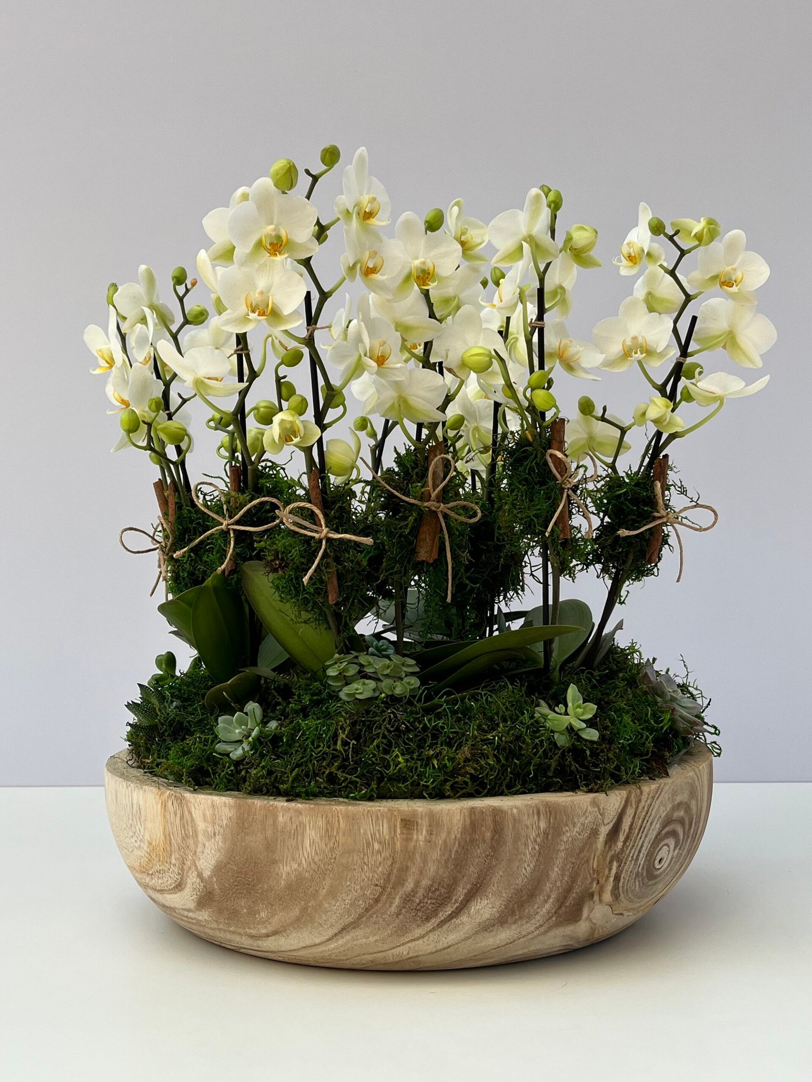 Mini Orquídeas Phalaenópsis brancas e suculentas em base de madeira, um encontro entre o natural e o sublime.