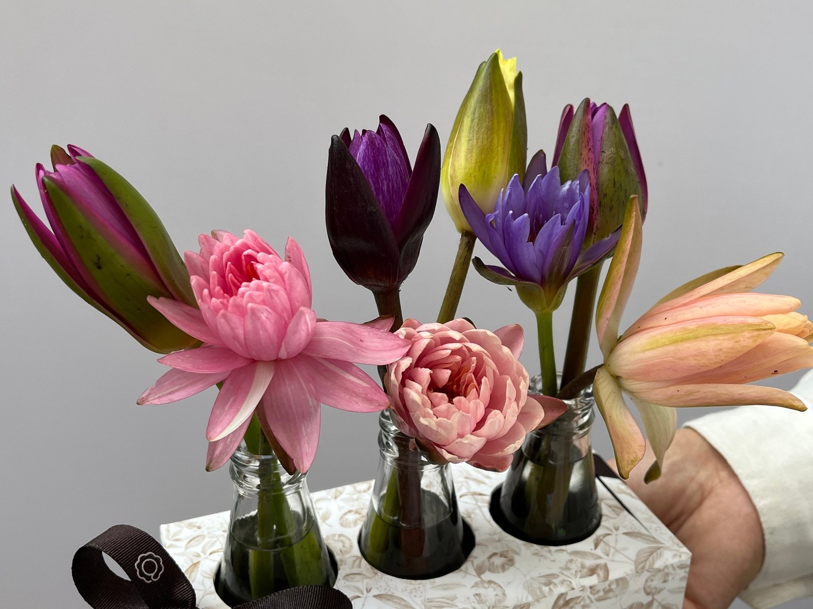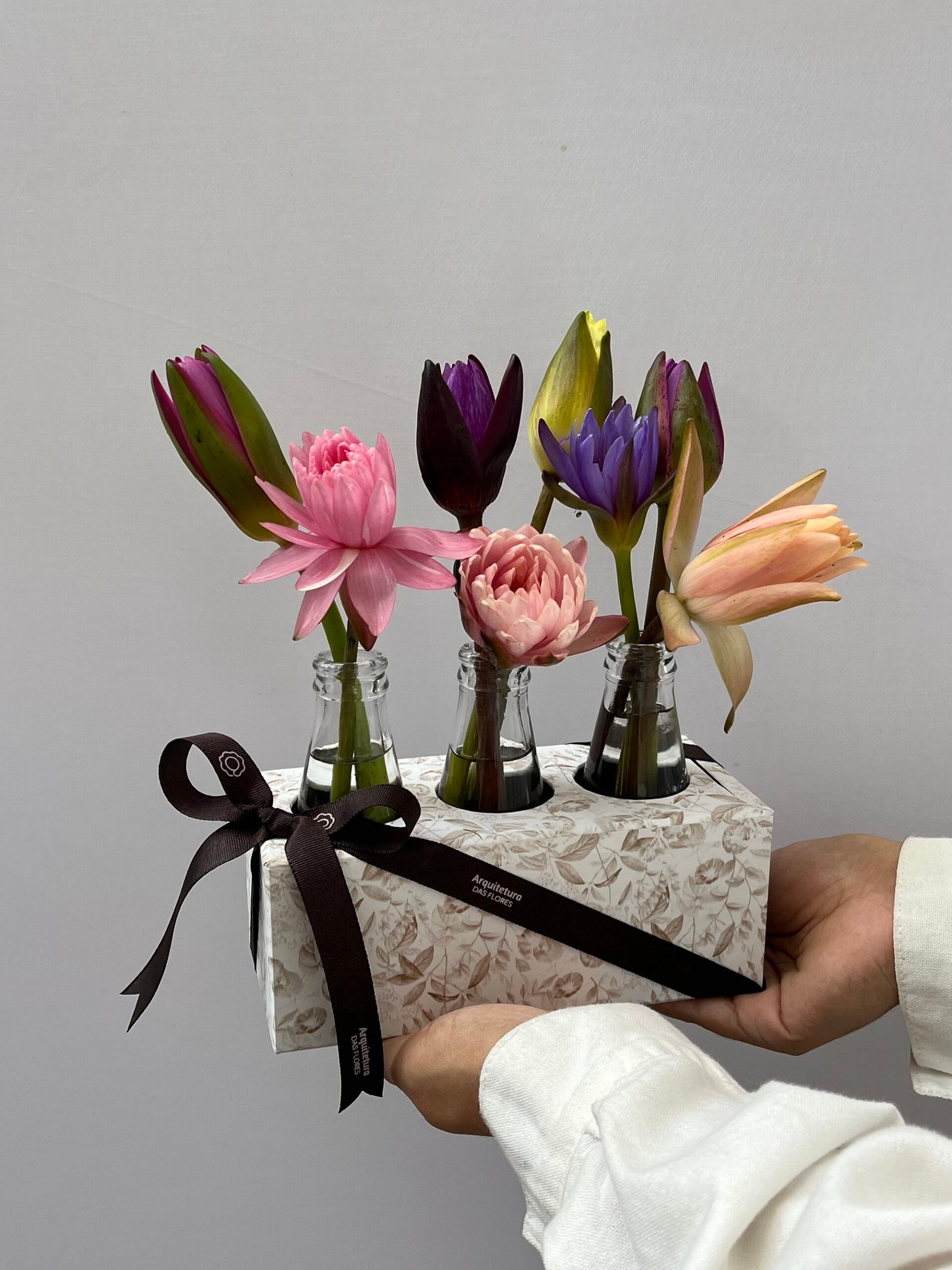 Box com Lótus em garrafinhas de vidro.