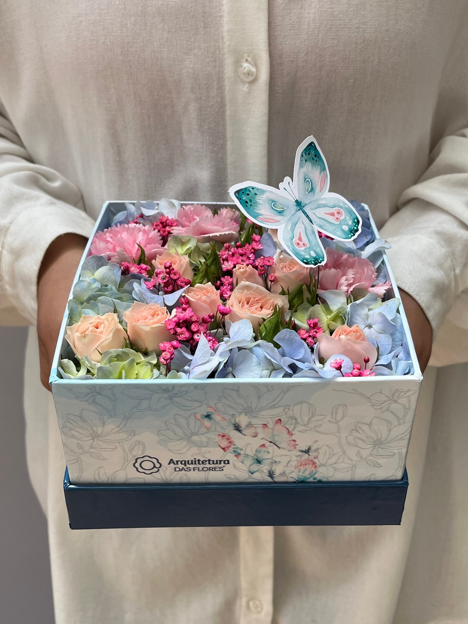 Box com Hortênsias, Mini Rosas, Mini Flores desdratadas e figura de borboleta.