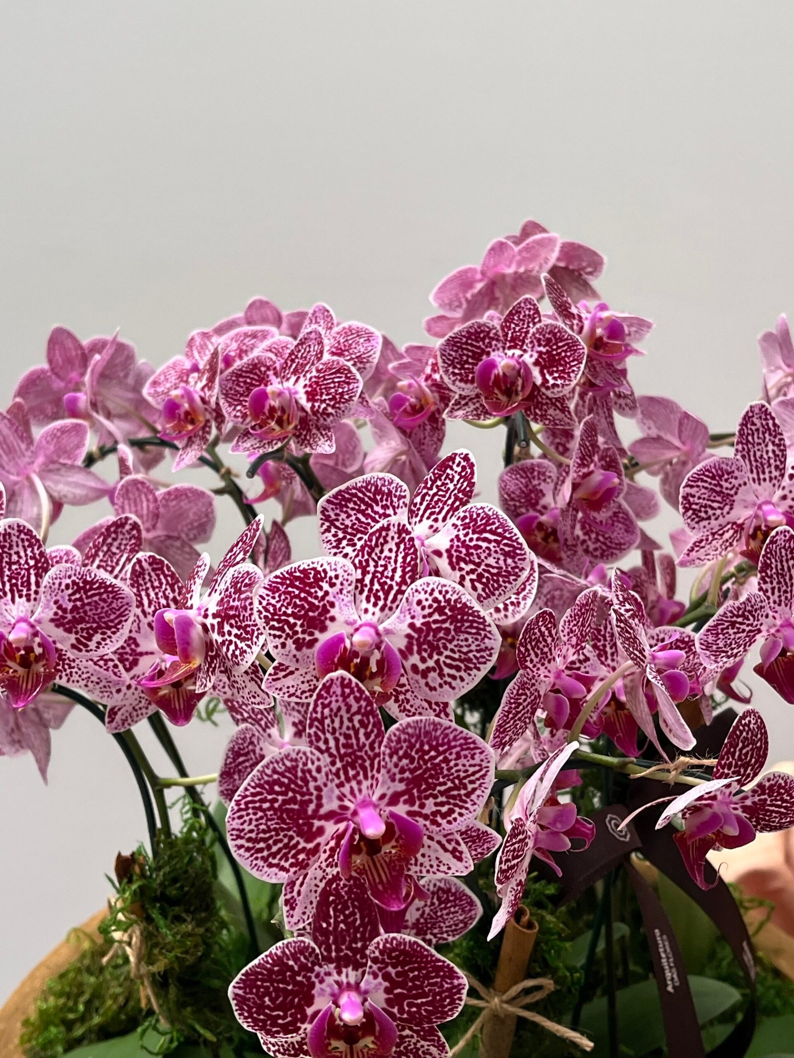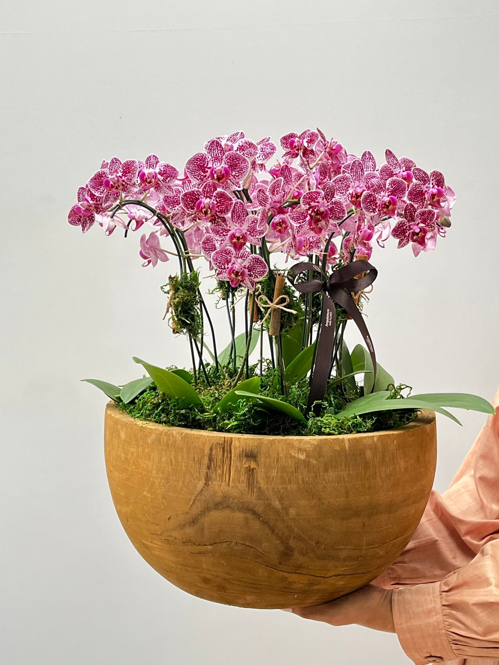 12 hastes de mini orquídeas plantadas em cachepô de cerâmica, adornadas com Canelas e laço de gorgorão marrom.
