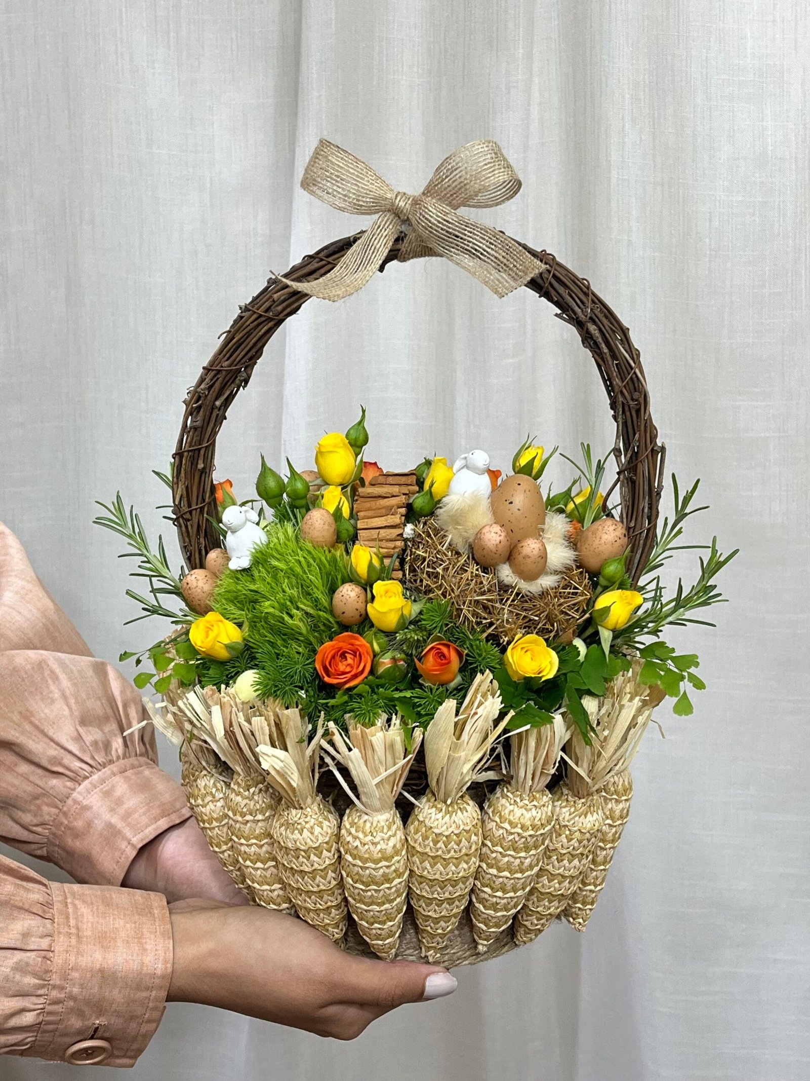 Uma cesta de Páscoa construída com olhar contemporâneo, unindo natureza e delicadeza em um conjunto coerente e bem resolvido.