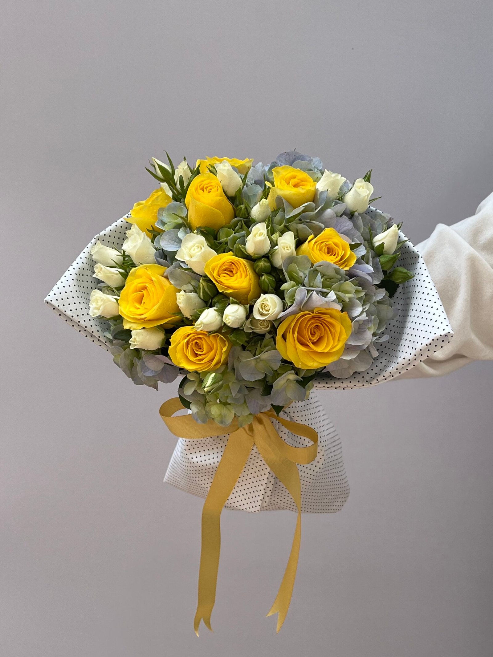 Buquê de rosas, mini rosas e hortênsias em tecido de algodão e laço dourado.