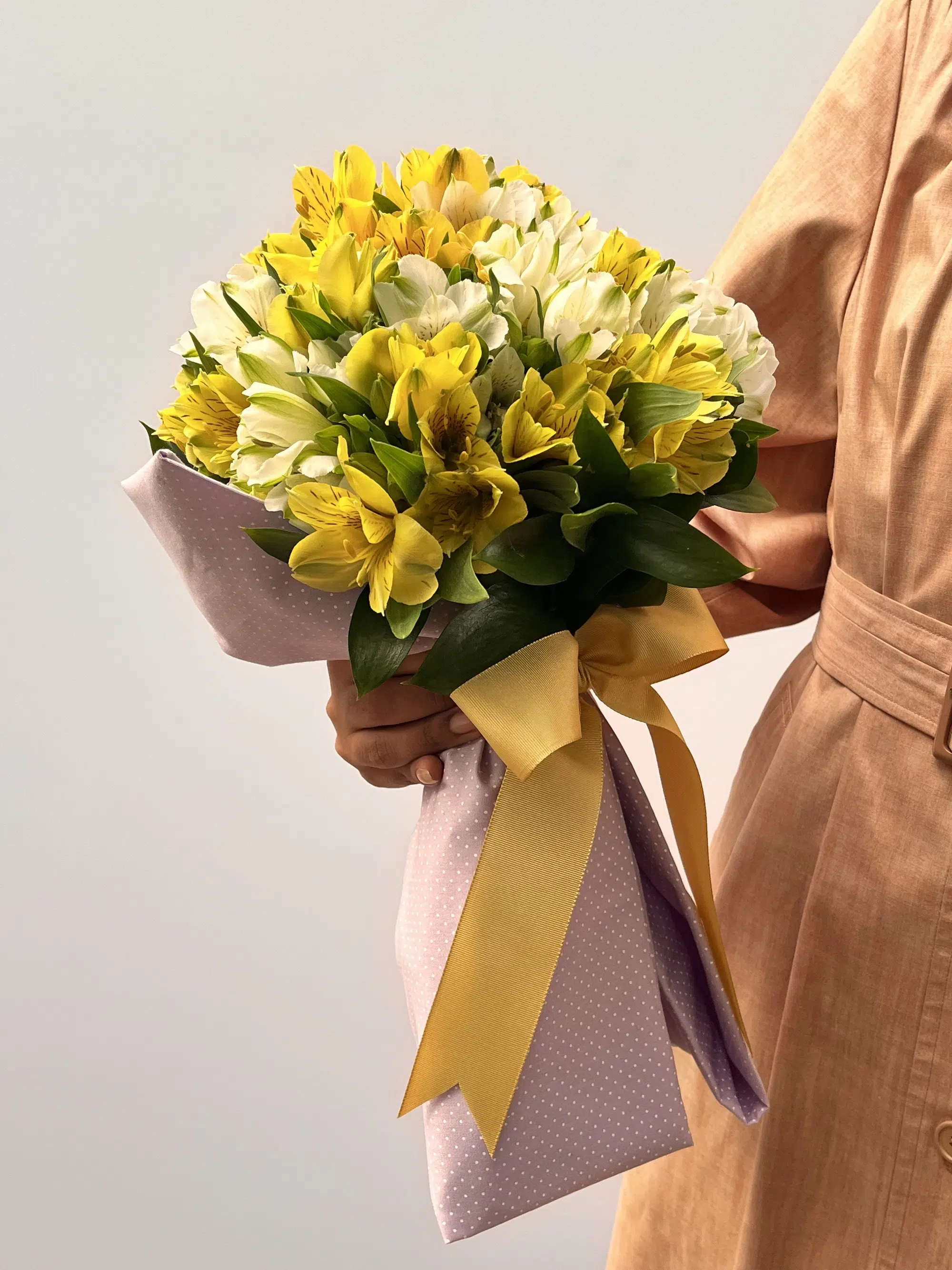 Fleur Lilas celebra a delicadeza e a alegria das astromélias amarelas e brancas, envoltas em um suave tecido lilás.