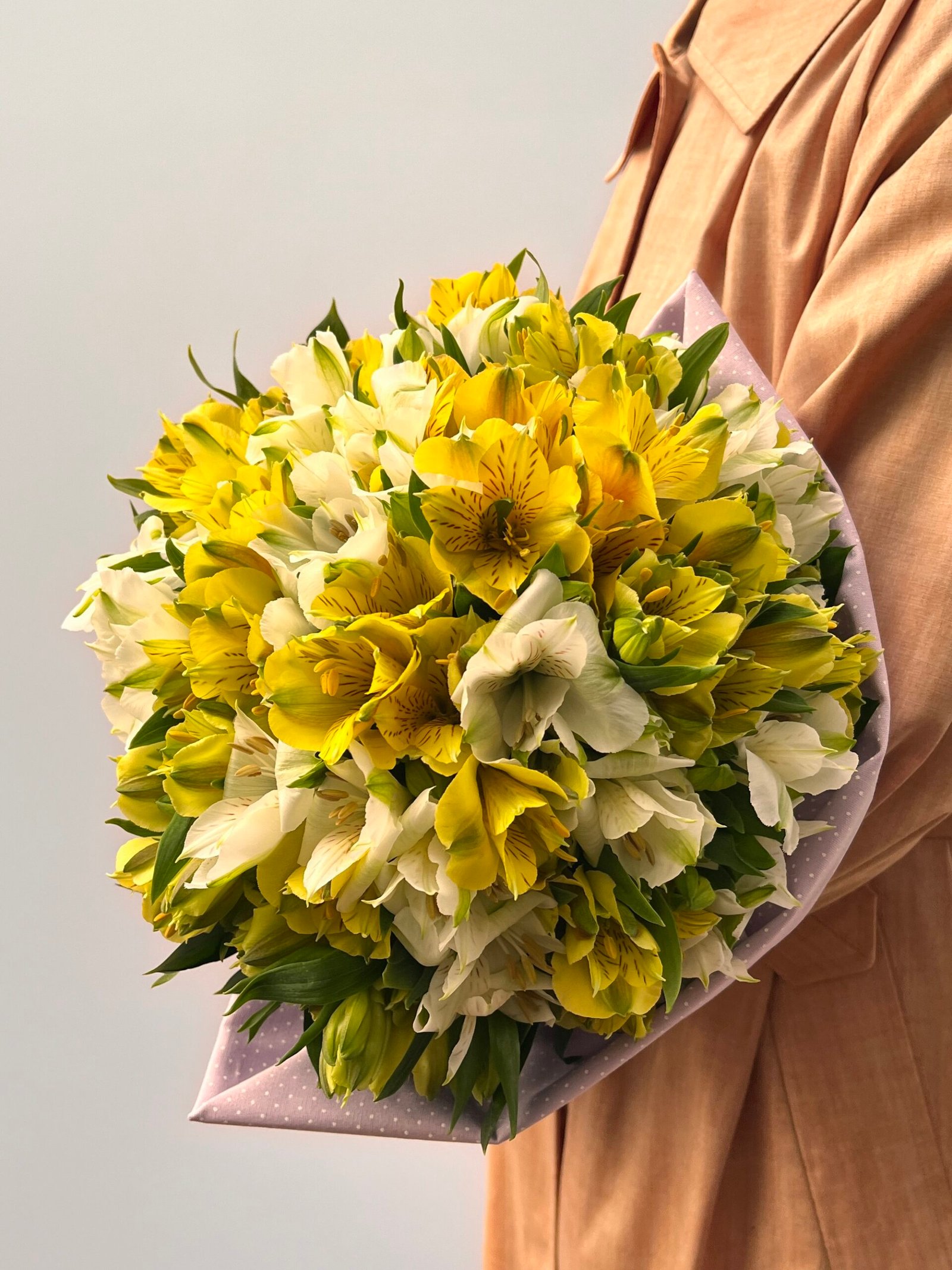 Astromelias amarelas, folhas de Ruscus, tecido e laço de cetim.