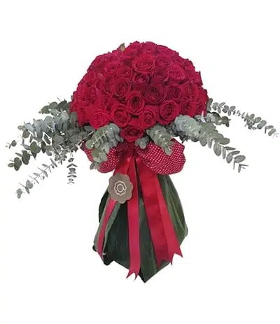 Buquê “Florence“, composto por 100 Rosas vermelhaS, folhas de Eucalipto cheiroso, acabamento em folhas naturais e laço de tecido poá.