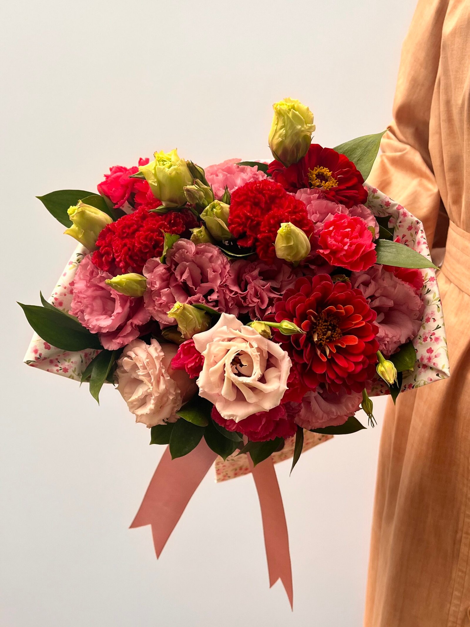 O delicado tecido floral que envolve o arranjo traz um toque charmoso e acolhedor, dando ainda mais personalidade à criação.