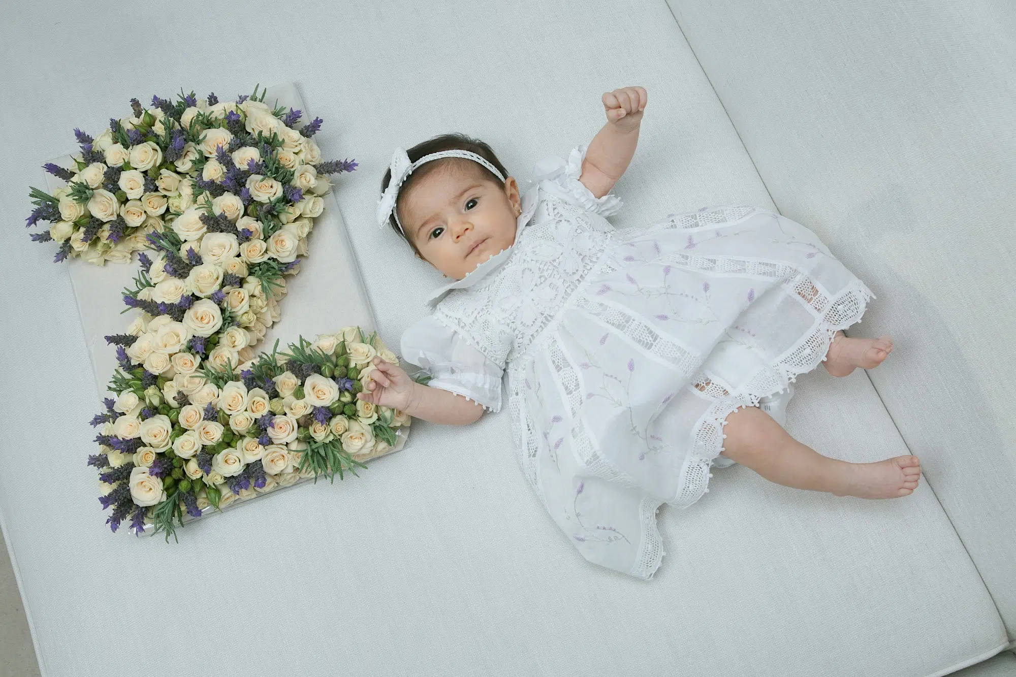 Arranjo em forma de número com flores de Mini Rosas. Especialmente para celebrar o mesversário do lindo bebê.