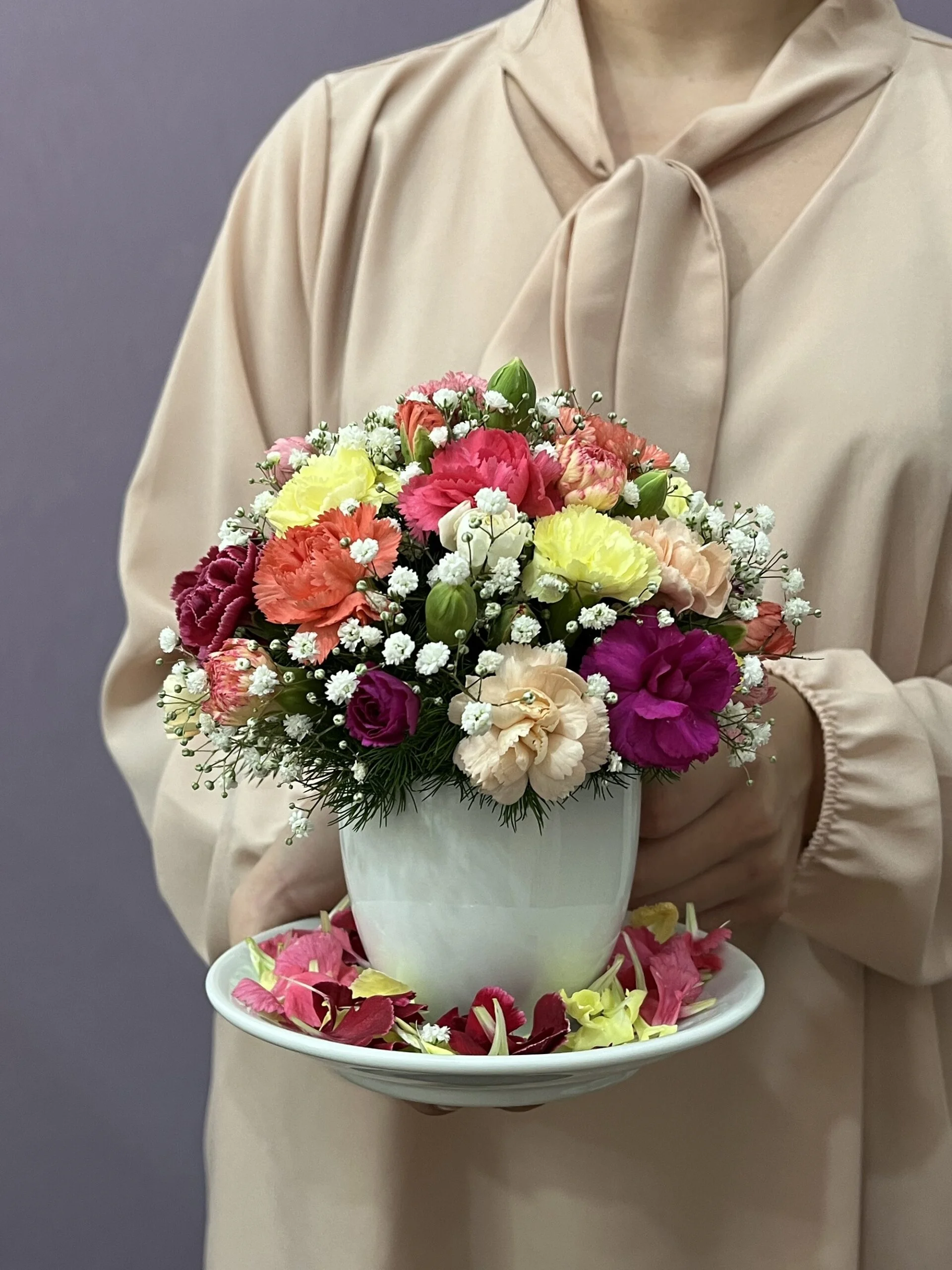 Delicado e alegre, o arranjo Gales destaca a beleza das Cravinas coloridas e a delicadeza das Gypsophilas em xícara de chá com laço de fita cetim,