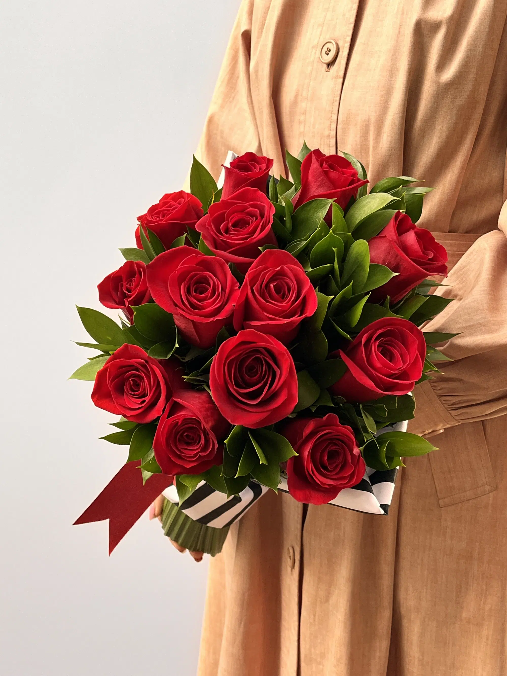 12 Rosas vermelhas Colombianas, Ruscus, Tecido de algodão, algodão umedecido e fita de gorgurão.