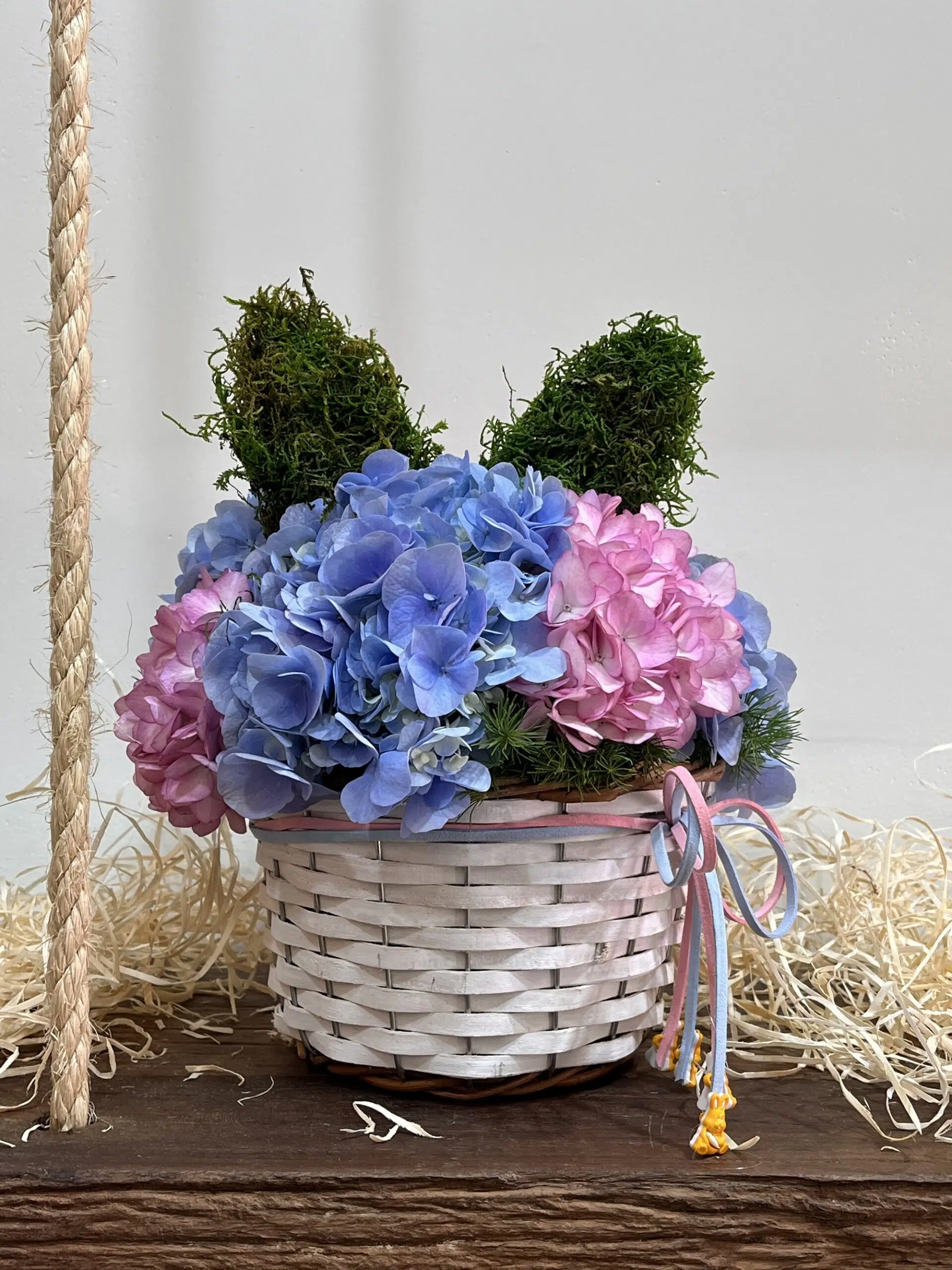 Lindo arranjo temático com flores de hortênsias rosa e azul em cesta. As orelhas decorativas trazem toda bossa ao presente tornando ainda mais exclusivo para a data especial.