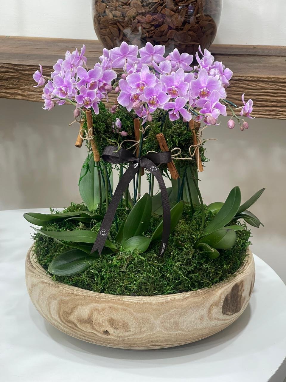 Arranjo com 12 hastes de mini orquídeas phalaenopsis rosas em vaso de madeira, com canelas e laço de gorgorão marrom.