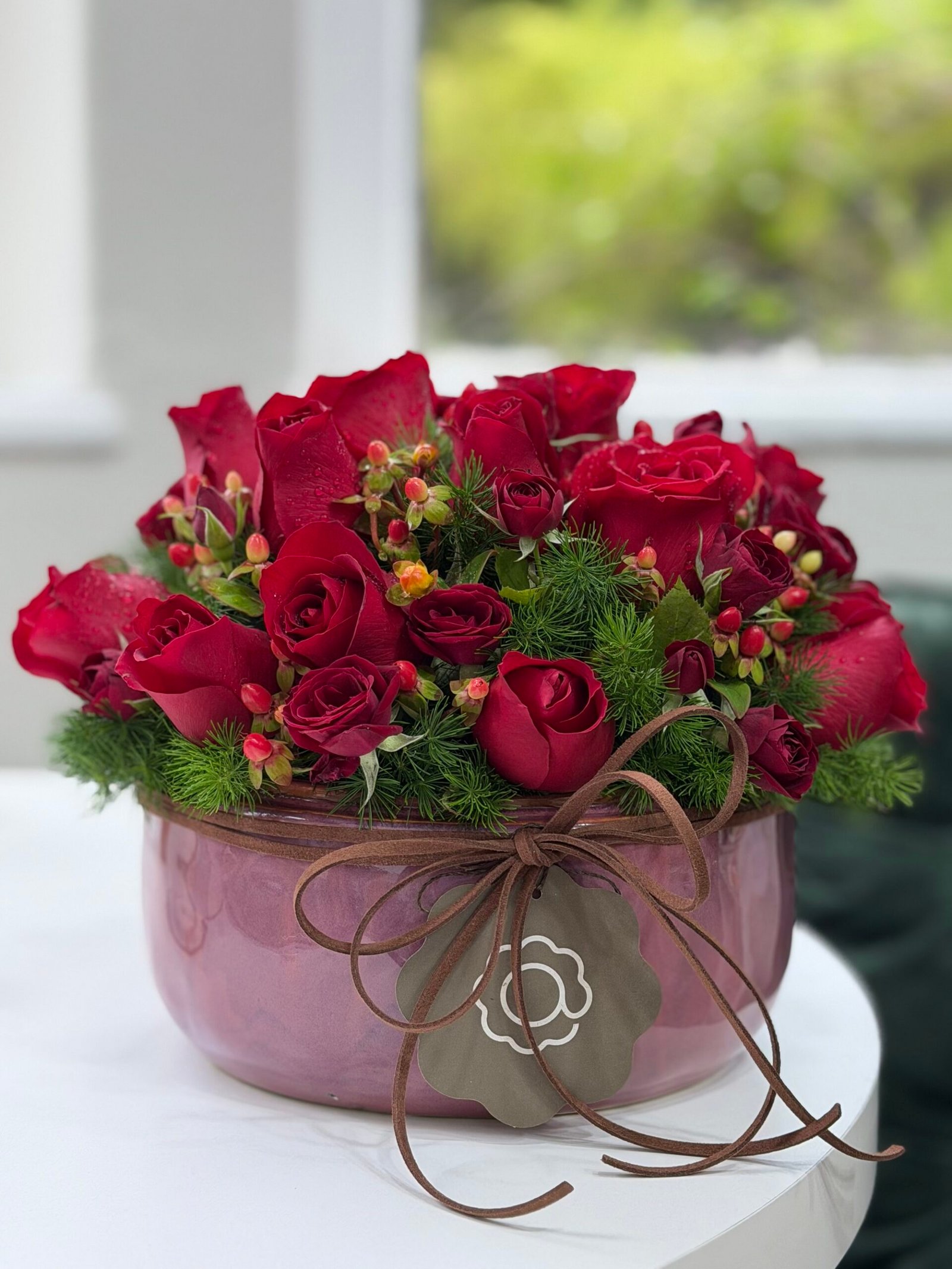 Arranjo composto por rosas e mini rosas vermelhas em uma sofisticada base de cerâmica.