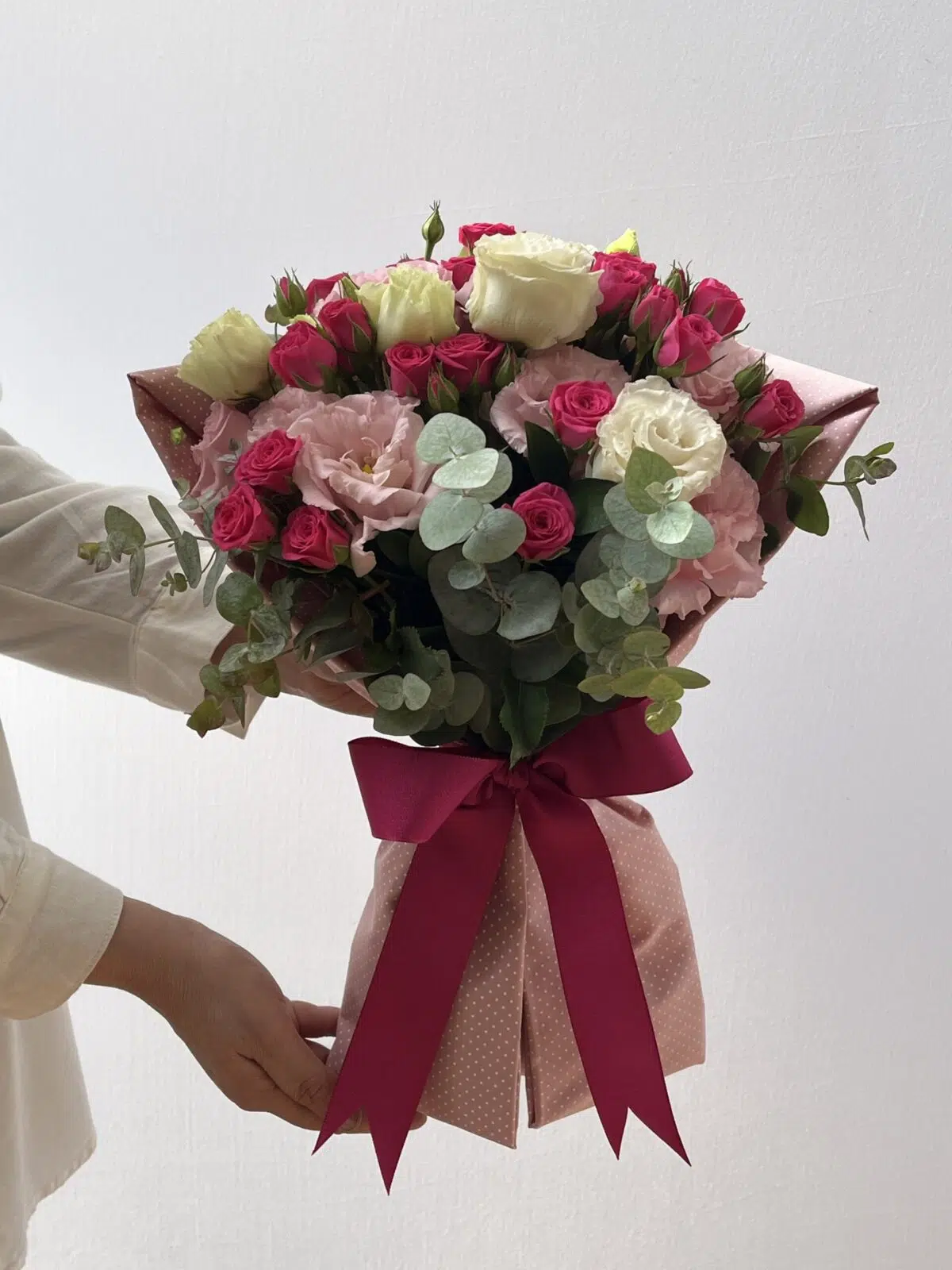 Delicado buquê com flores de Lisianthus rosa e Mini Rosas pink, unidos à verdes variados e onde a embalagem exclusiva de tecido torna o presente ainda mais especial.