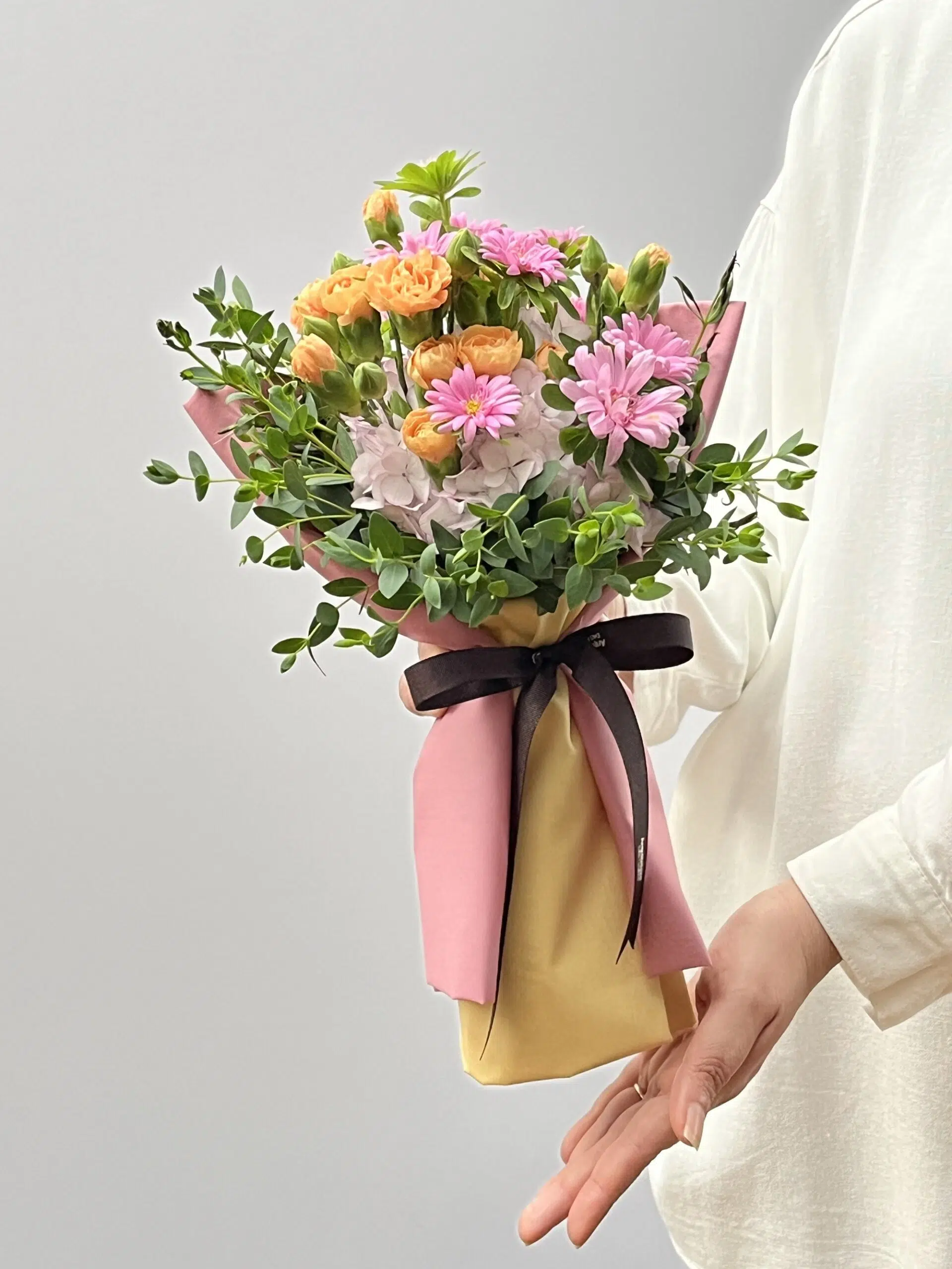 Buquê de Rainha Margarida, Cravinas, Hortênsia, Green Ball, e mini Eucaliptos.