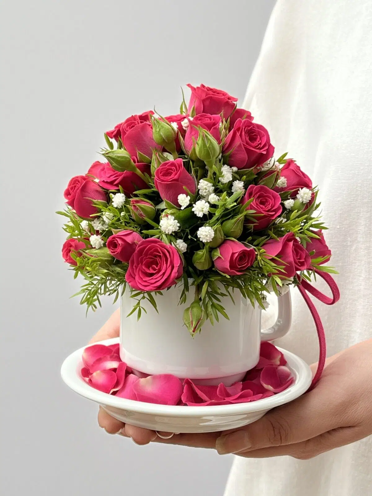 Delicado arranjo de mini rosas na cor pink e gypsophila em xícara de cerâmica, a composição perfeita do carinho de presentear junto a arte de decorar.