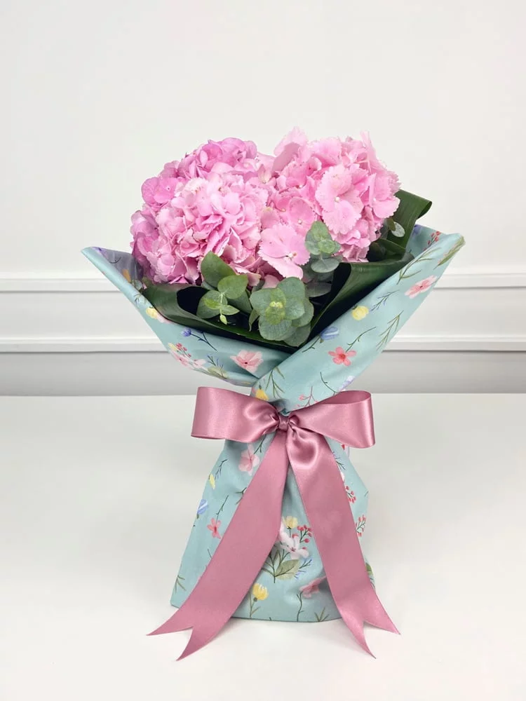Prepare-se para mergulhar em uma experiência encantadora com este buquê de Hortênsias cor-de-rosa e folhas de eucaliptos, habilmente arranjado em um tecido estampado adornado com delicadas flores e uma fita de cetim. Este é o presente perfeito para despertar emoções e deixar uma impressão duradoura.