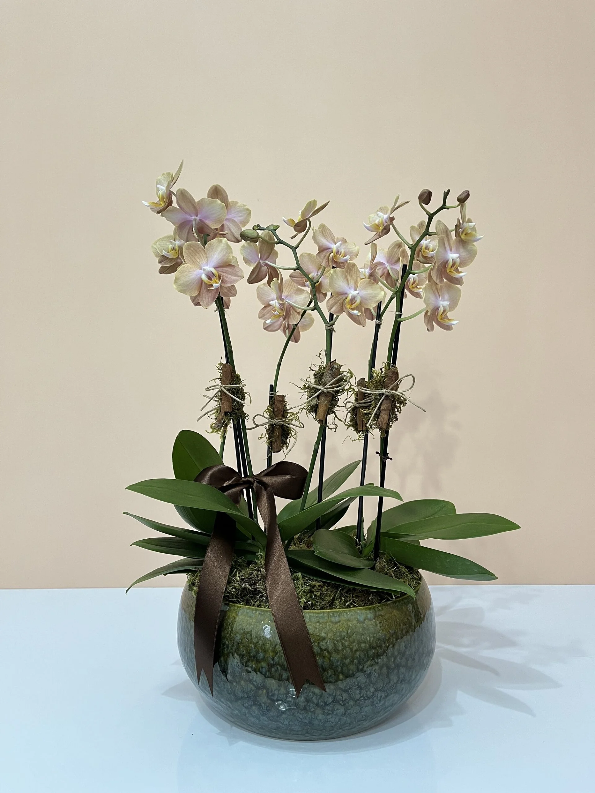 Mini Orquídeas Phalaenopsis champannhe em vaso de cerâmica.