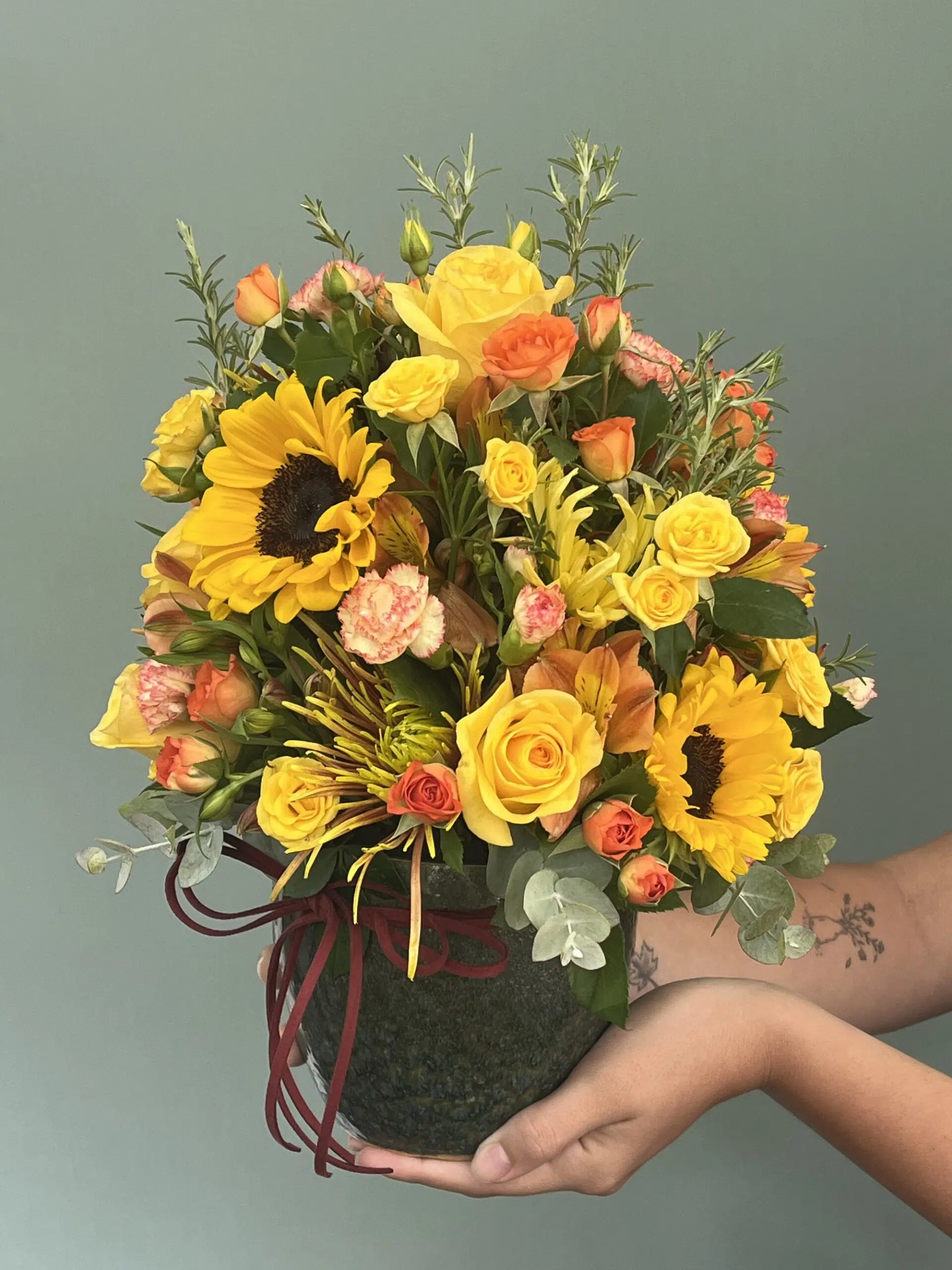 Arranjo de flores em tons de amarelo, cuidadosamente dispostas em vaso de cerâmica.