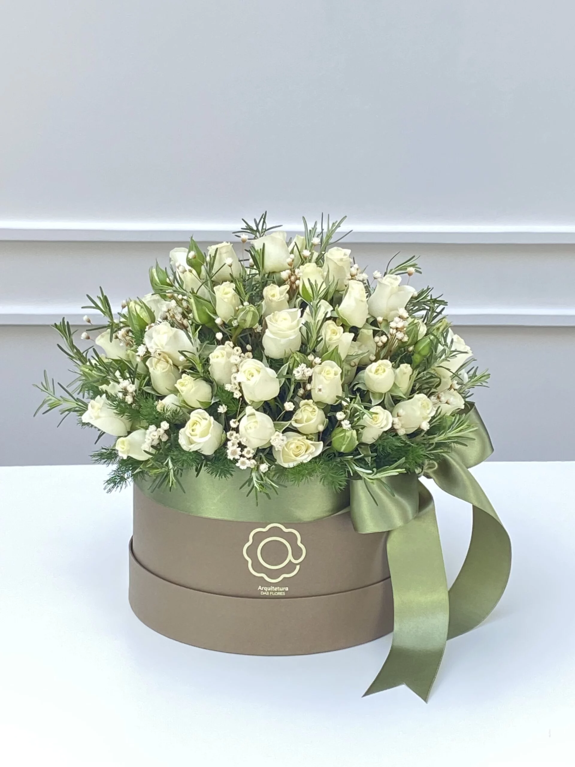 Seja para celebrar um aniversário, aniversário de casamento, ou simplesmente para mostrar o quanto alguém é amado, a Box Flower com Mini Rosas brancas, Mini Flores secas e Alecrins é a escolha perfeita.