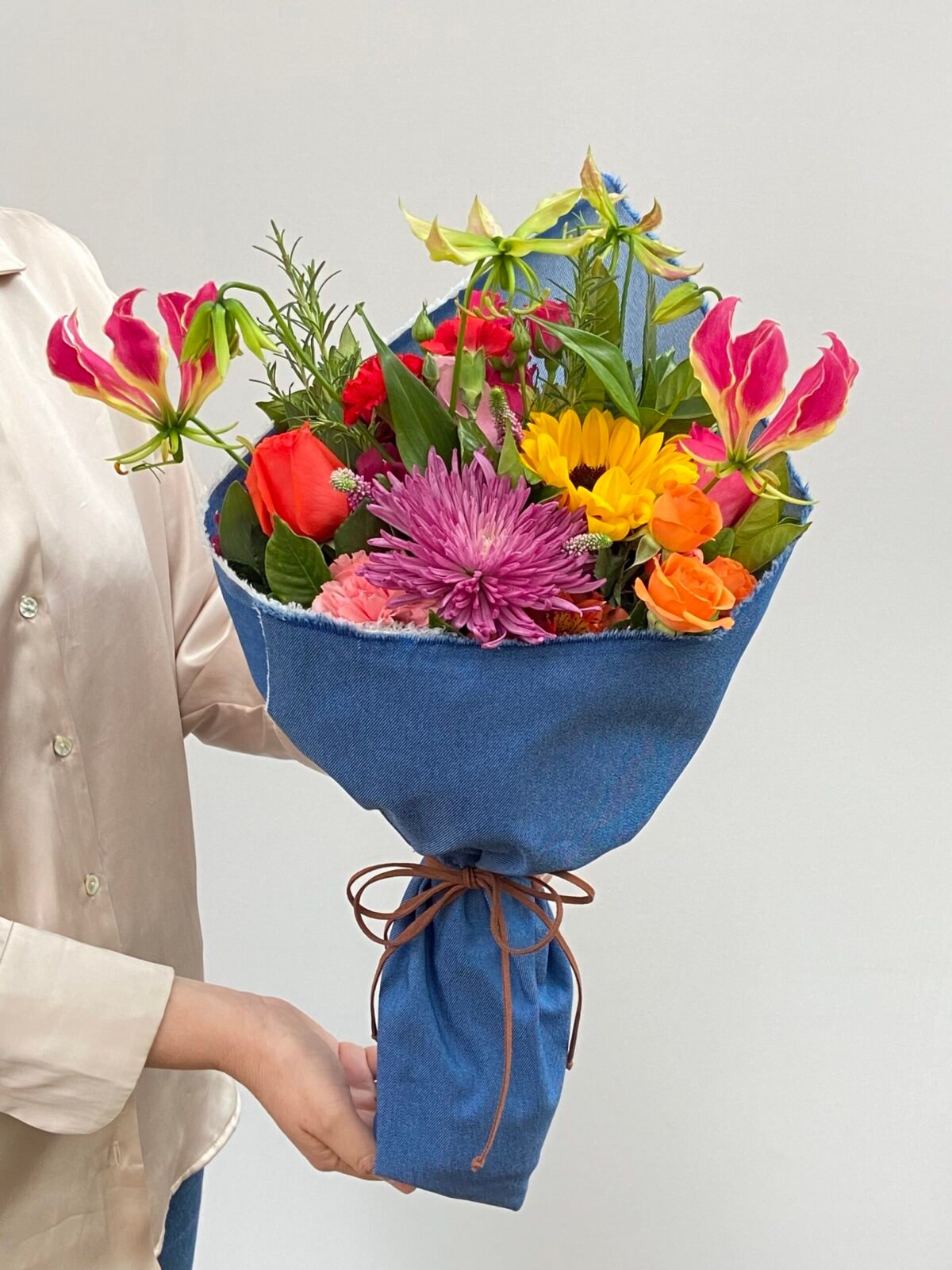 Buquê de Flores mistas envolto tecido Jeans e laço de camurça.