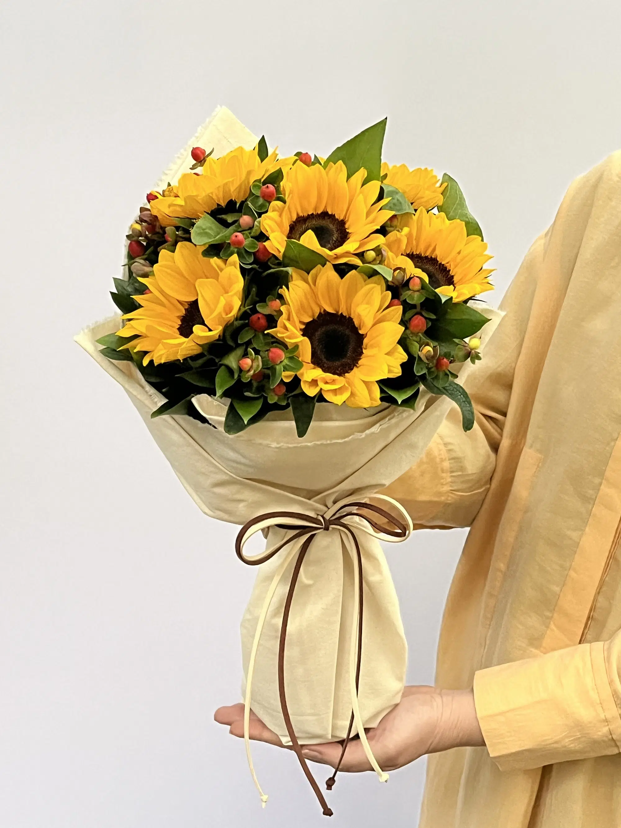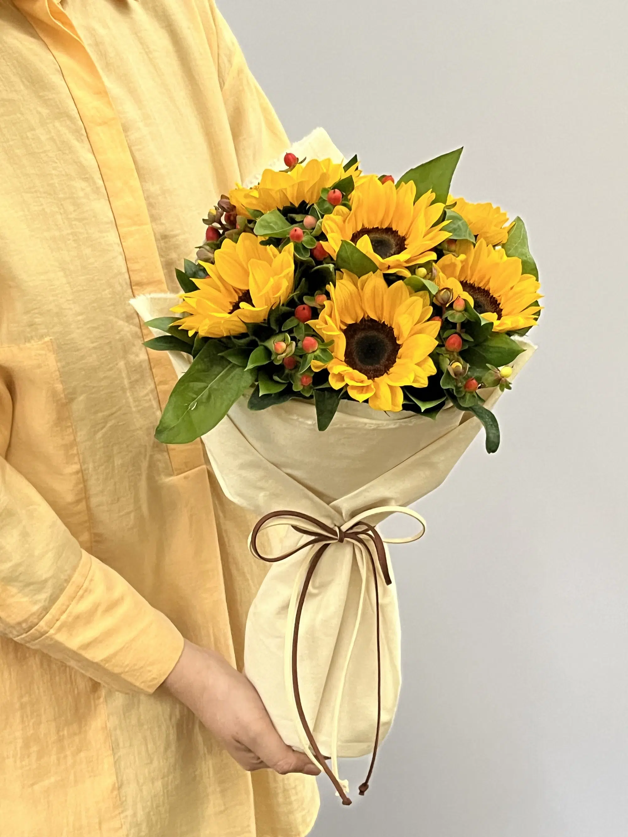 Girassóis, Hypericums, Eucaliptos, tecido de algodão crú e laço de camurça.