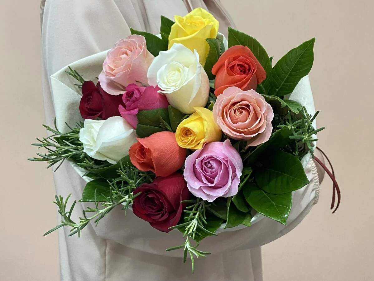 Buquê de 12 rosas coloridas e folhas de gardênias, cuidadosamente reunidos e adornados com um tecido de algodão crú e laço de camurça.