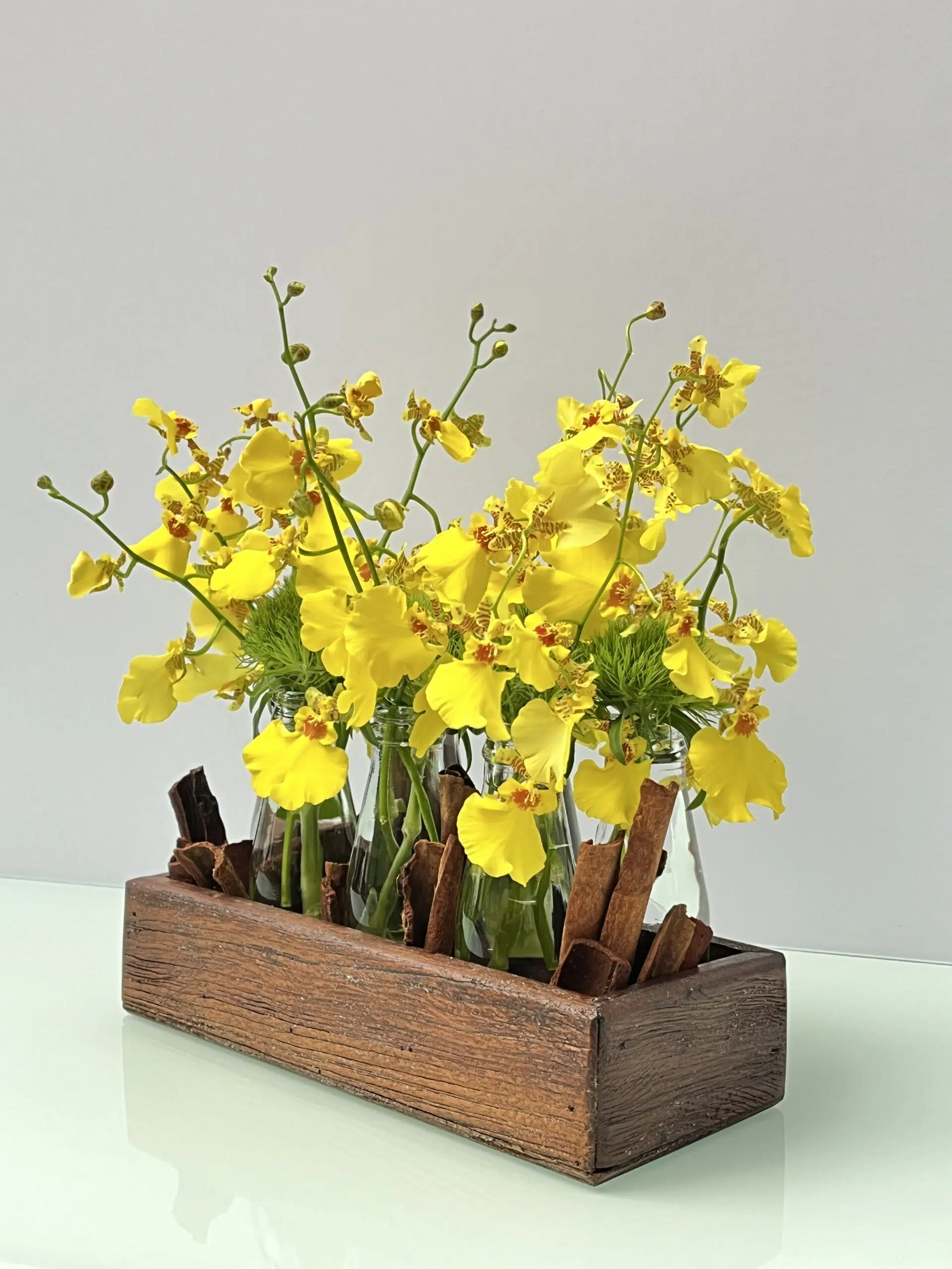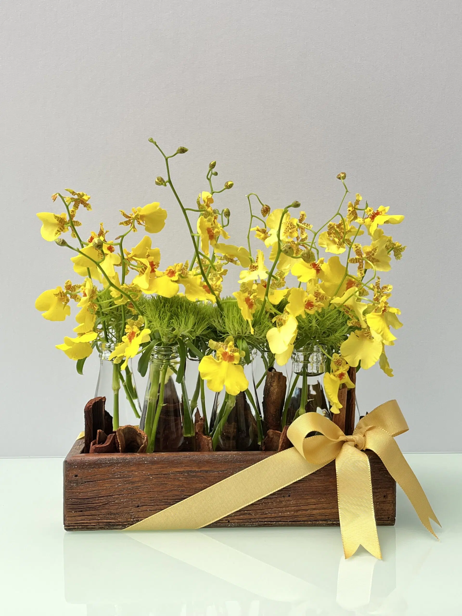 Arranjo de Orquídeas ‘Chuva de Ouro’ em base de madeira, adornado com delicadas garrafinhas de vidro, Green Balls e Canelas.