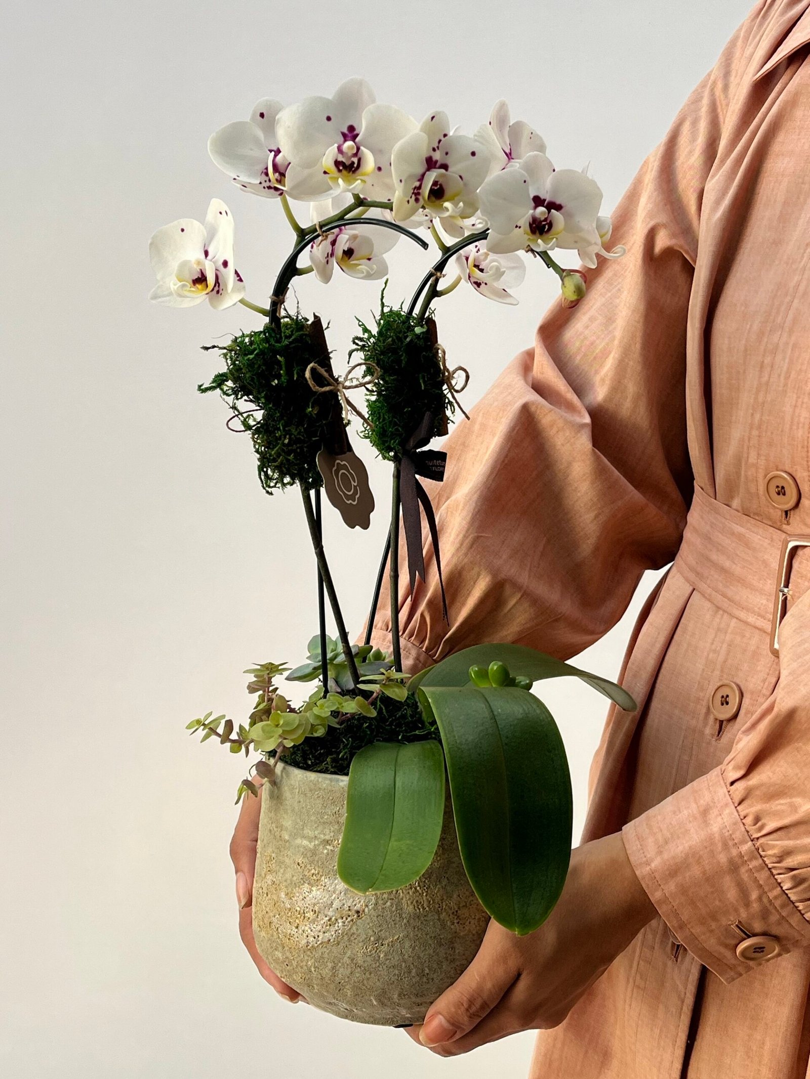 Mini Orquídea Phalaenopsis com 02 hastes, plantada em cachepô de cerâmica, com acabamento em musgo desidratado, Suculentas, canelas e laço de gorgorão marrom.