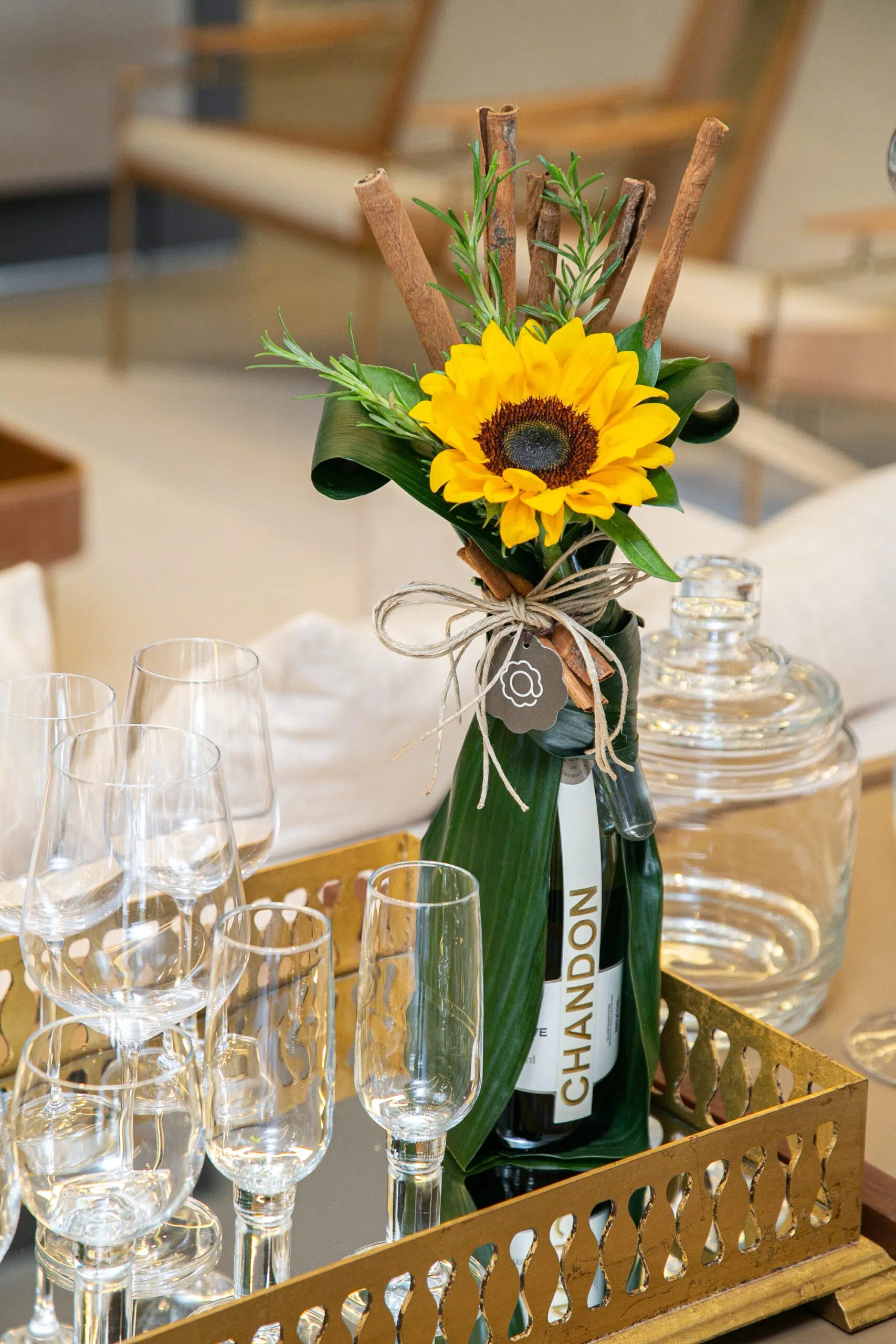 Este lindo arranjo “Lumière Du Soleil”, para brindar, é composto por um Girassol, uma garrafa de espumante Chandon Demi Sec, canela em pau e folhas naturais.