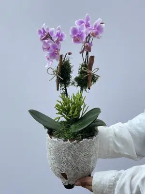 Arranjo composto por 02 hastes de mini Orquídeas Phalaenopsis em vaso de cerâmica.