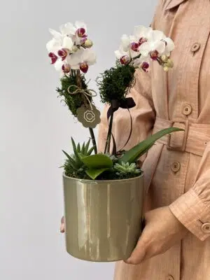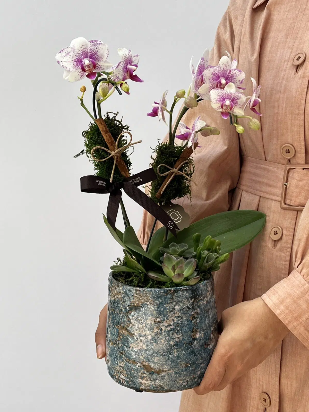 Luna di Fiore é uma composição que une o requinte da orquídea branca com toques rosados à beleza terrosa das suculentas, tudo harmonizado em um vaso rústico de cerâmica azul.