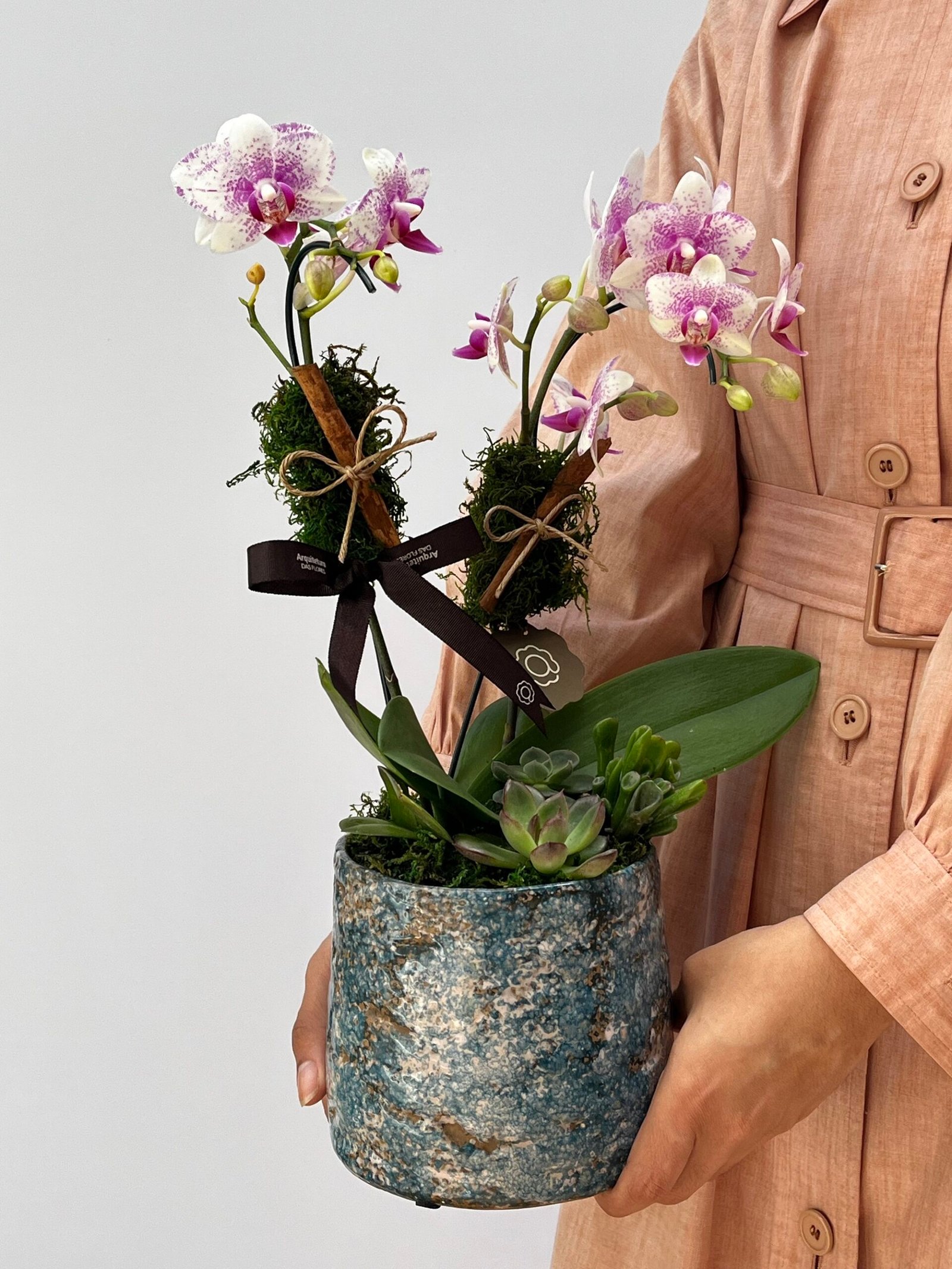 Mini Orquídea Phalaenopsis com 02 hastes, plantada em cachepô de cerâmica, com acabamento em musgo desidratado, Suculentas, canelas e laço de gorgorão marrom.