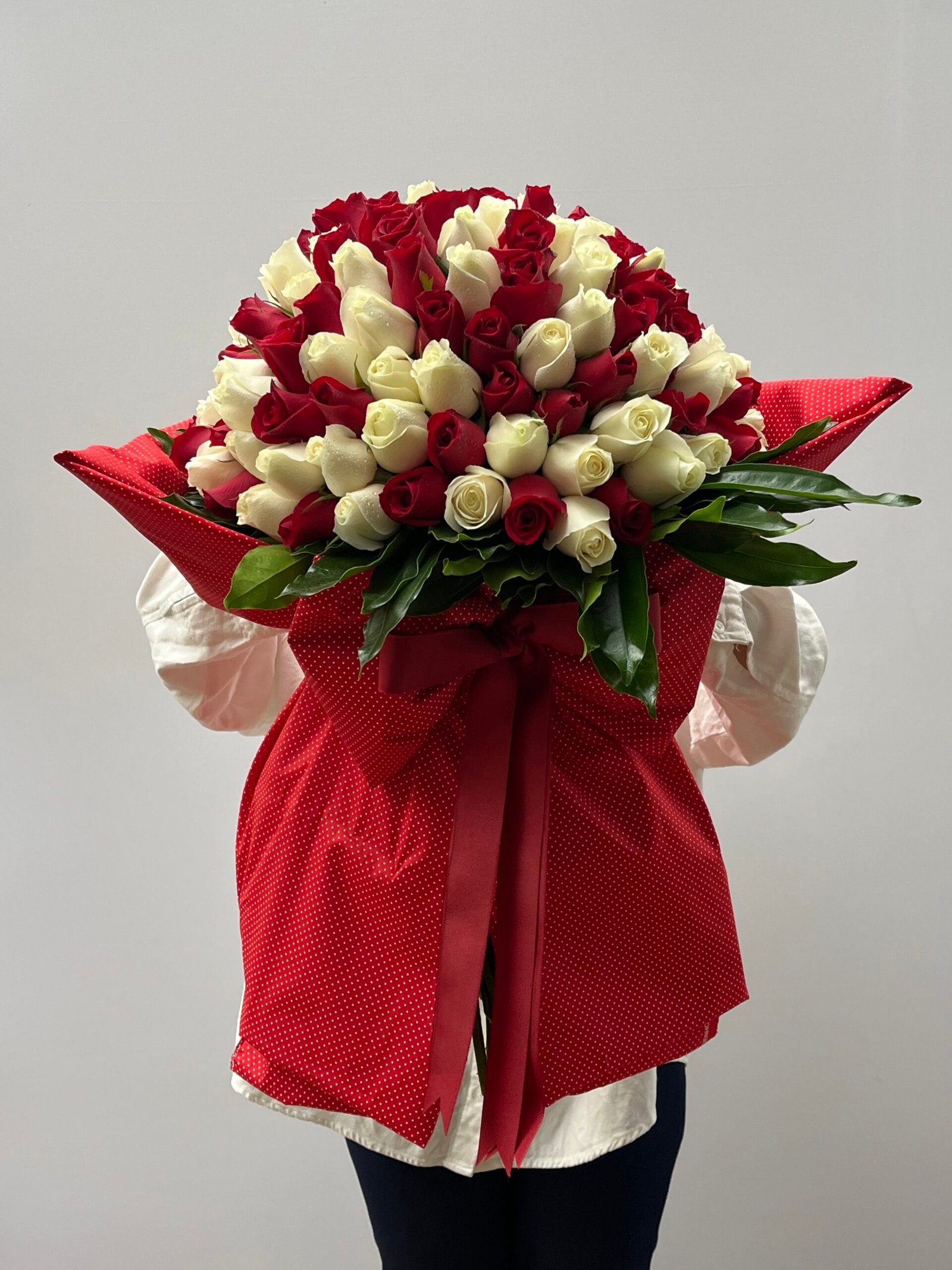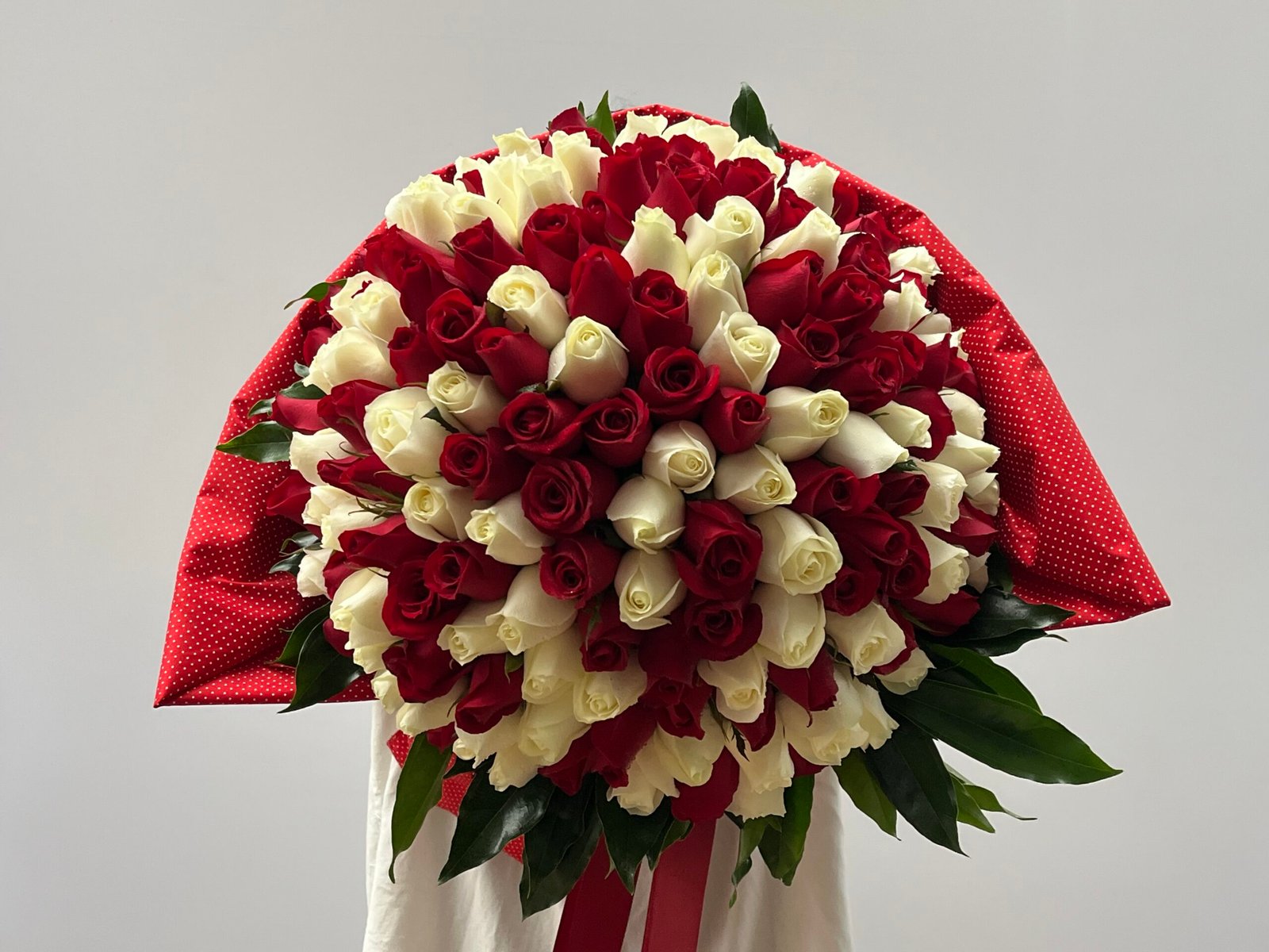 Buquê confeccionado com 150 rosas entre vermelhas e brancas.