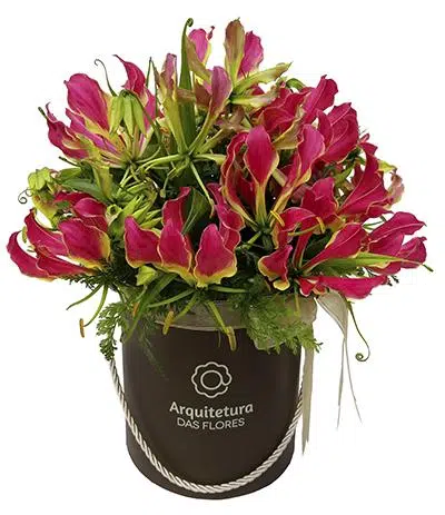 Inspirado no charme da França, “Maitê” esse lindo arranjo de flores de Gloriosas ficam muito charmosas em box customizada da Arquitetura das Flores.