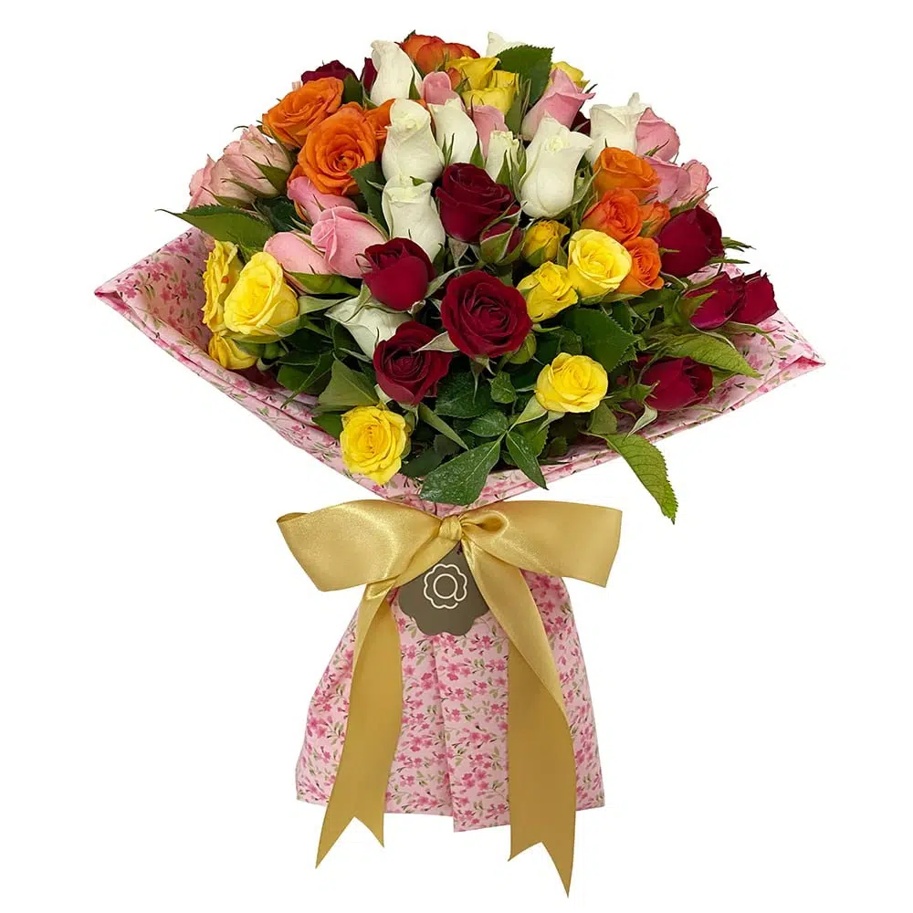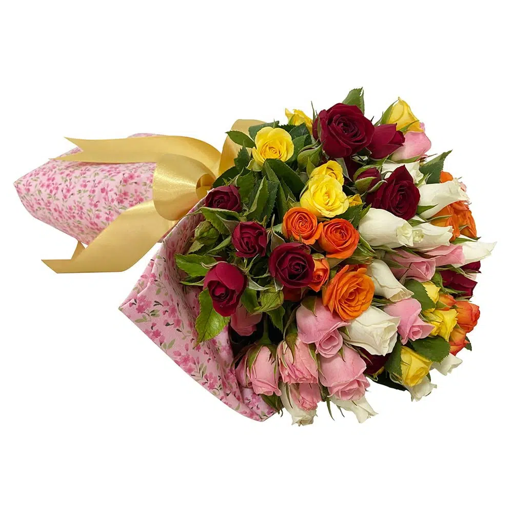 Delicado buquê de Mini Rosas coloridas em estampa floral exclusiva em tons cor de rosa com laço de fita cetim dourada.