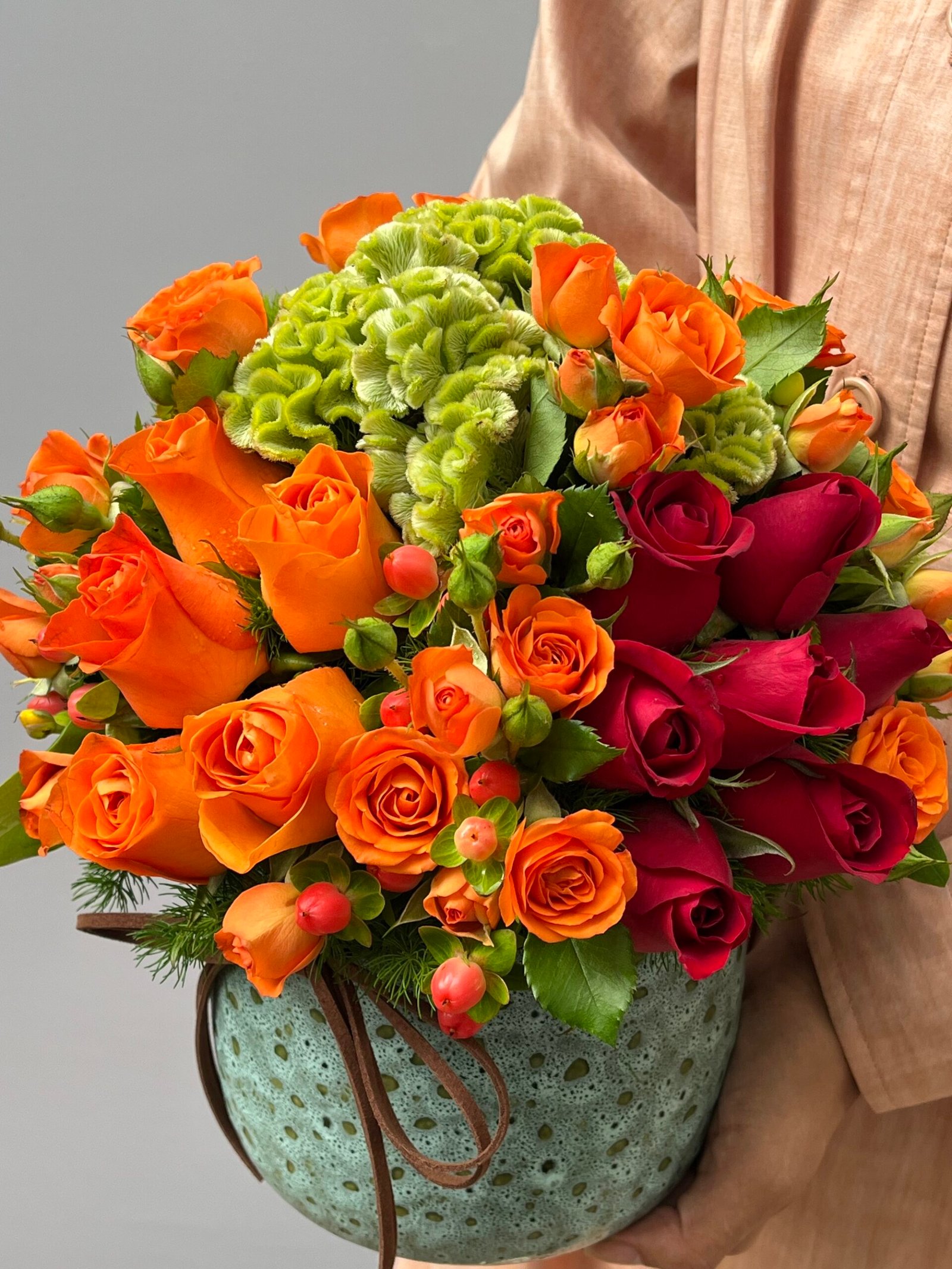 Arranjo de Rosas, mini Rosas, Celósias e Hypericum em vaso de cerâmica com laço de camurça.