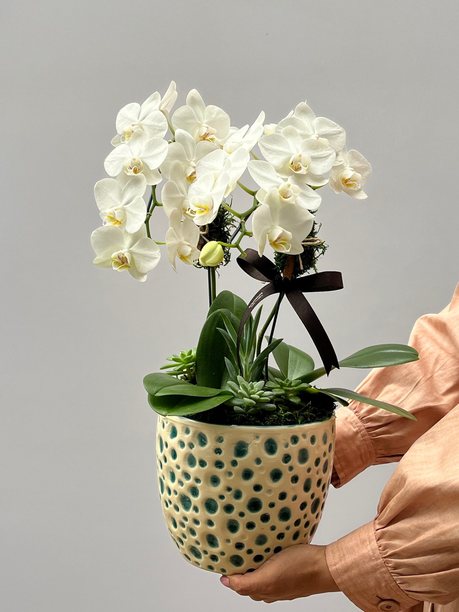 Mini Orquídea Phalaenopsis cascata com 02 hastes, plantada em cachepô de cerâmica, com acabamento em musgo desidratado, Suculentas, canelas e laço de gorgorão marrom.