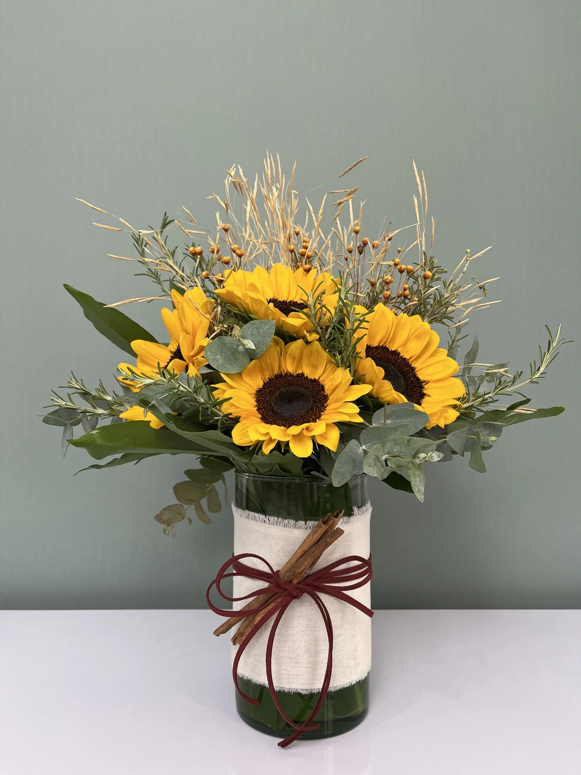 Arranjo de Girassois em vaso de vidro cilíndrico.