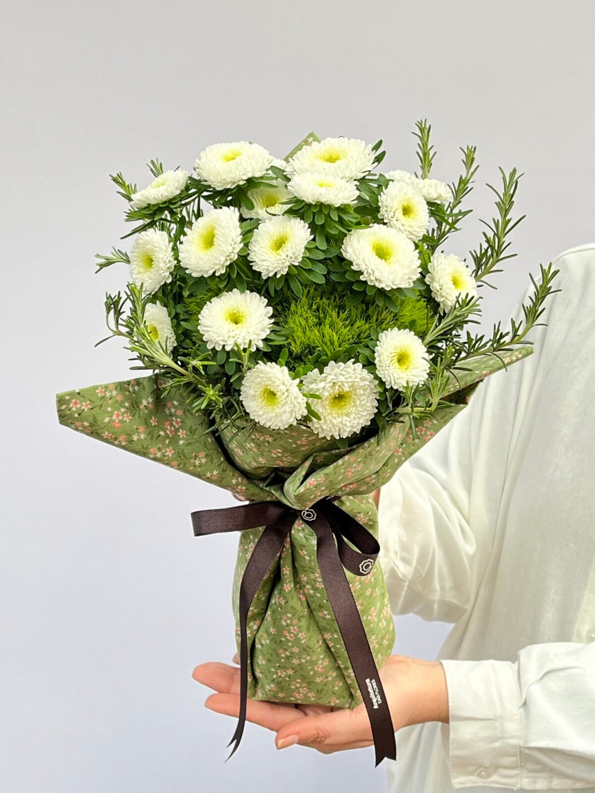 Buquê de Rainha Margarida, Green Ball e Alecrins, elegantemente envolto em tecido verde florido e decorado com fita de gorgorão.