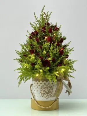 Um perfumado arranjo de Tuia Limão e muito original, com pinhas decorativas e detalhes de flores de Mini Rosas, tornando a comemoração natalina, muito especial e carinhosa.