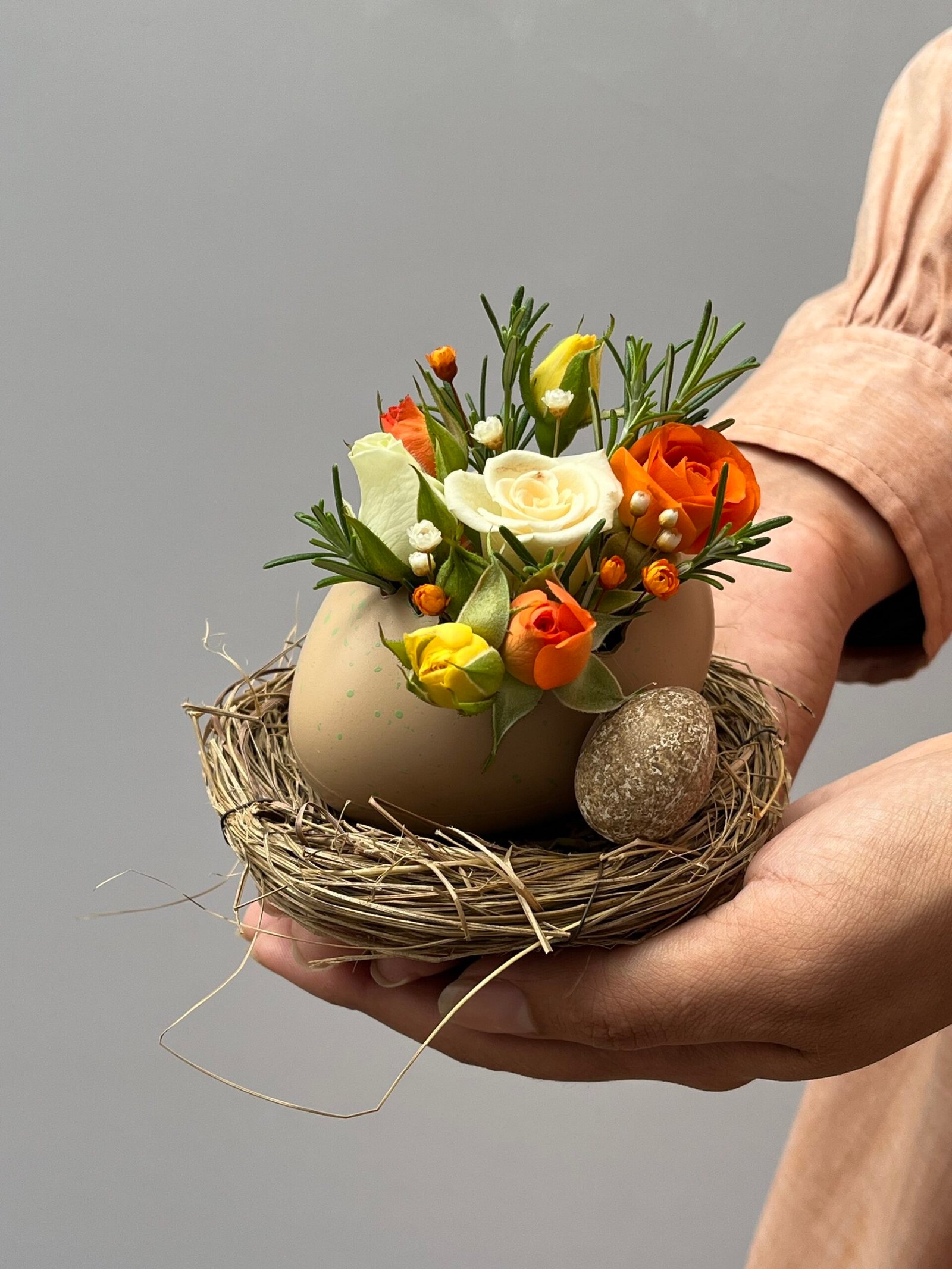 Arranjo em ninho artificial com mini Rosas, mini flores desidratadas e Alecrim.