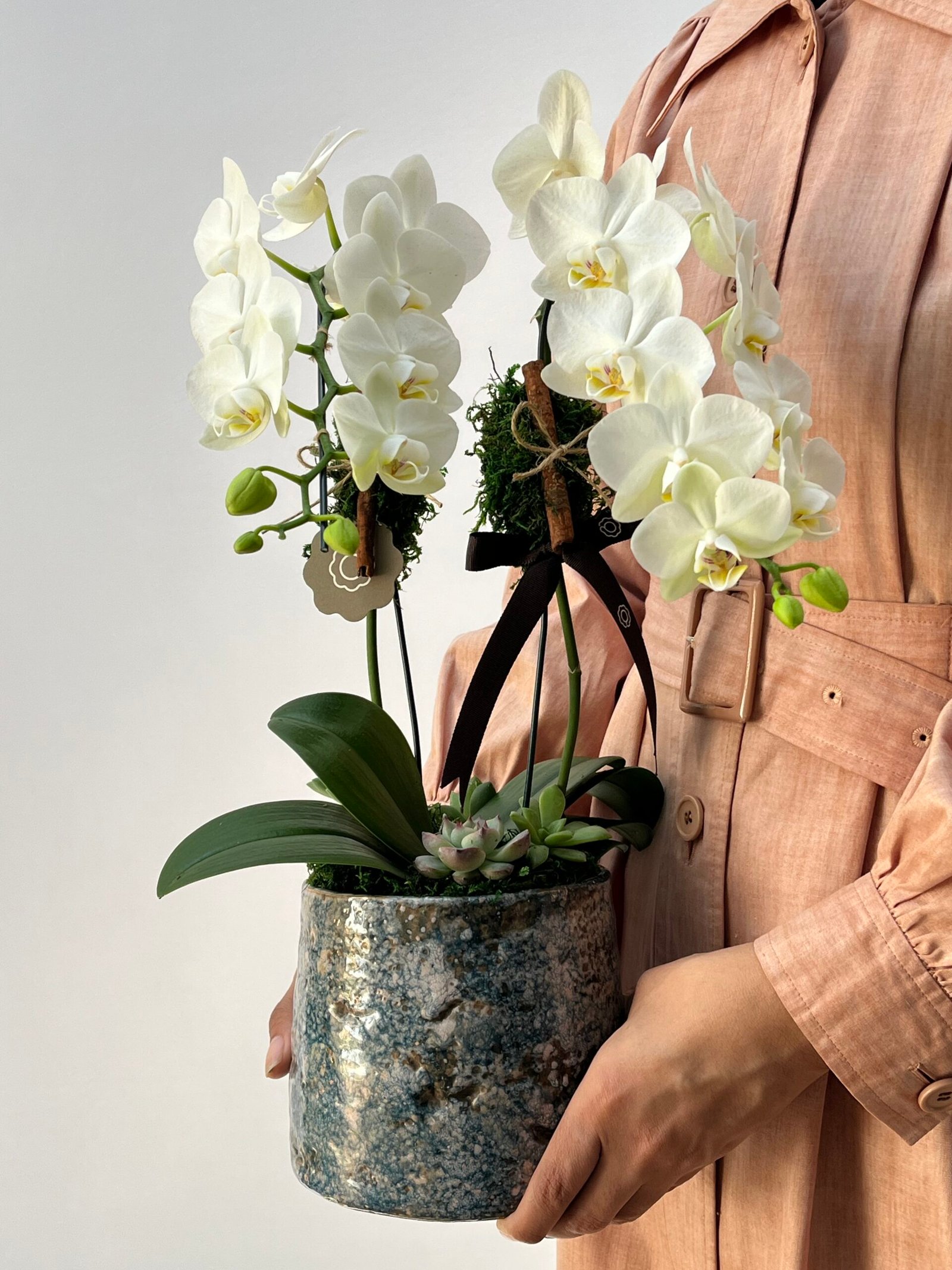 Mini Orquídea Phalaenopsis com 02 hastes, plantada em cachepô de cerâmica, com acabamento em musgo desidratado, Suculentas, canelas e laço de gorgorão marrom.