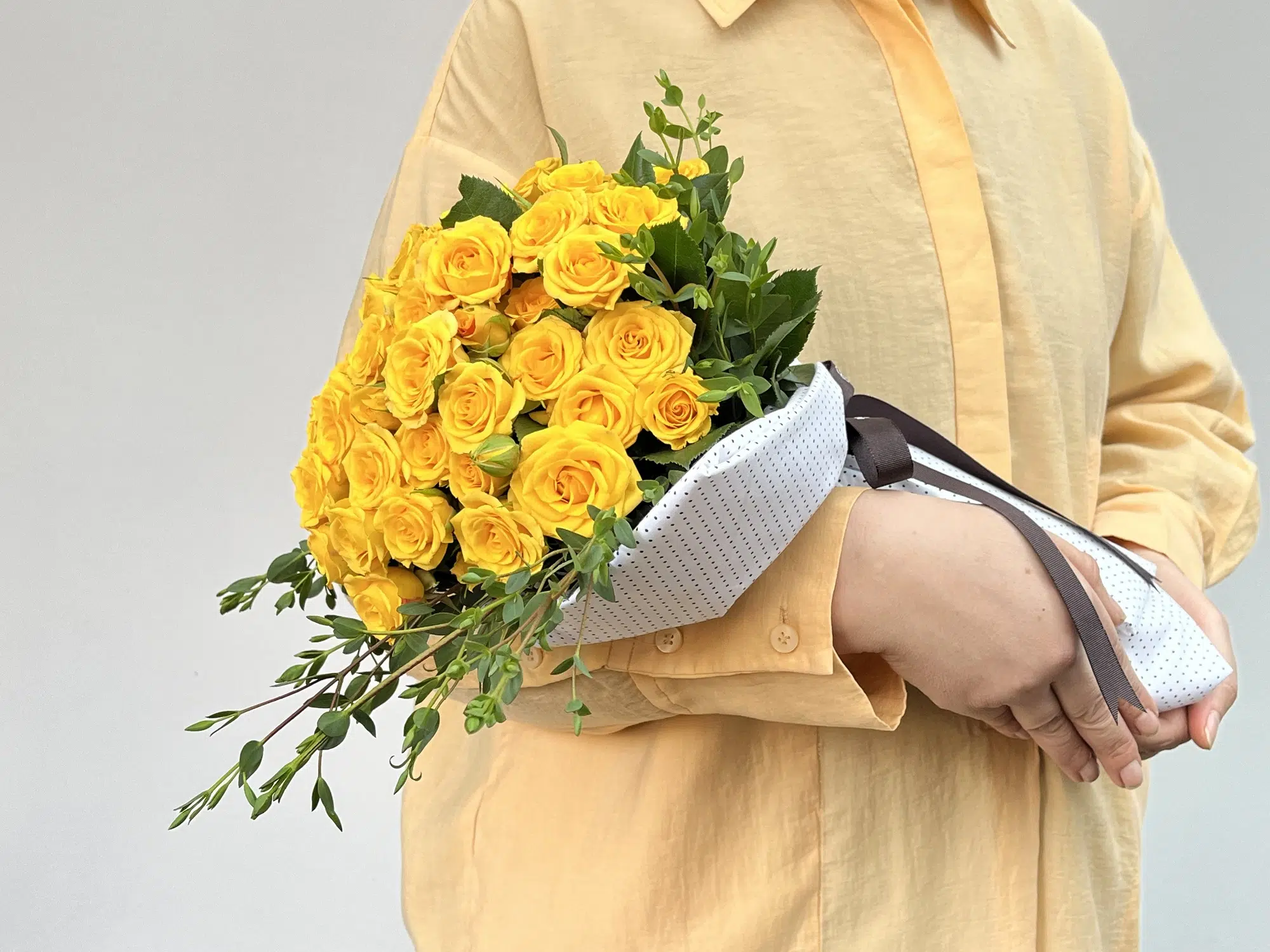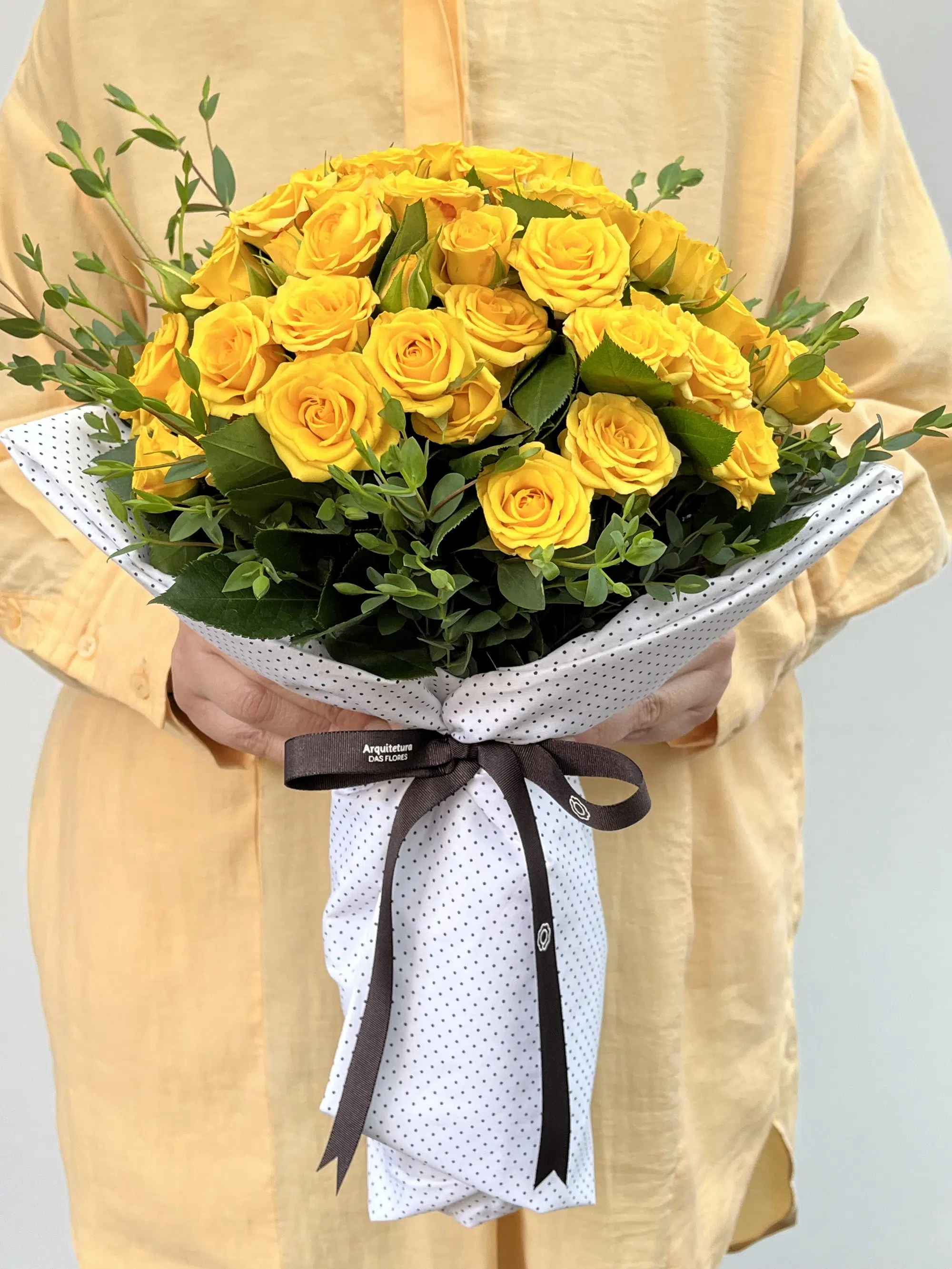 Mini Rosas Amarelas, Mini Eucaliptos, tecido e fita de gorgorão.