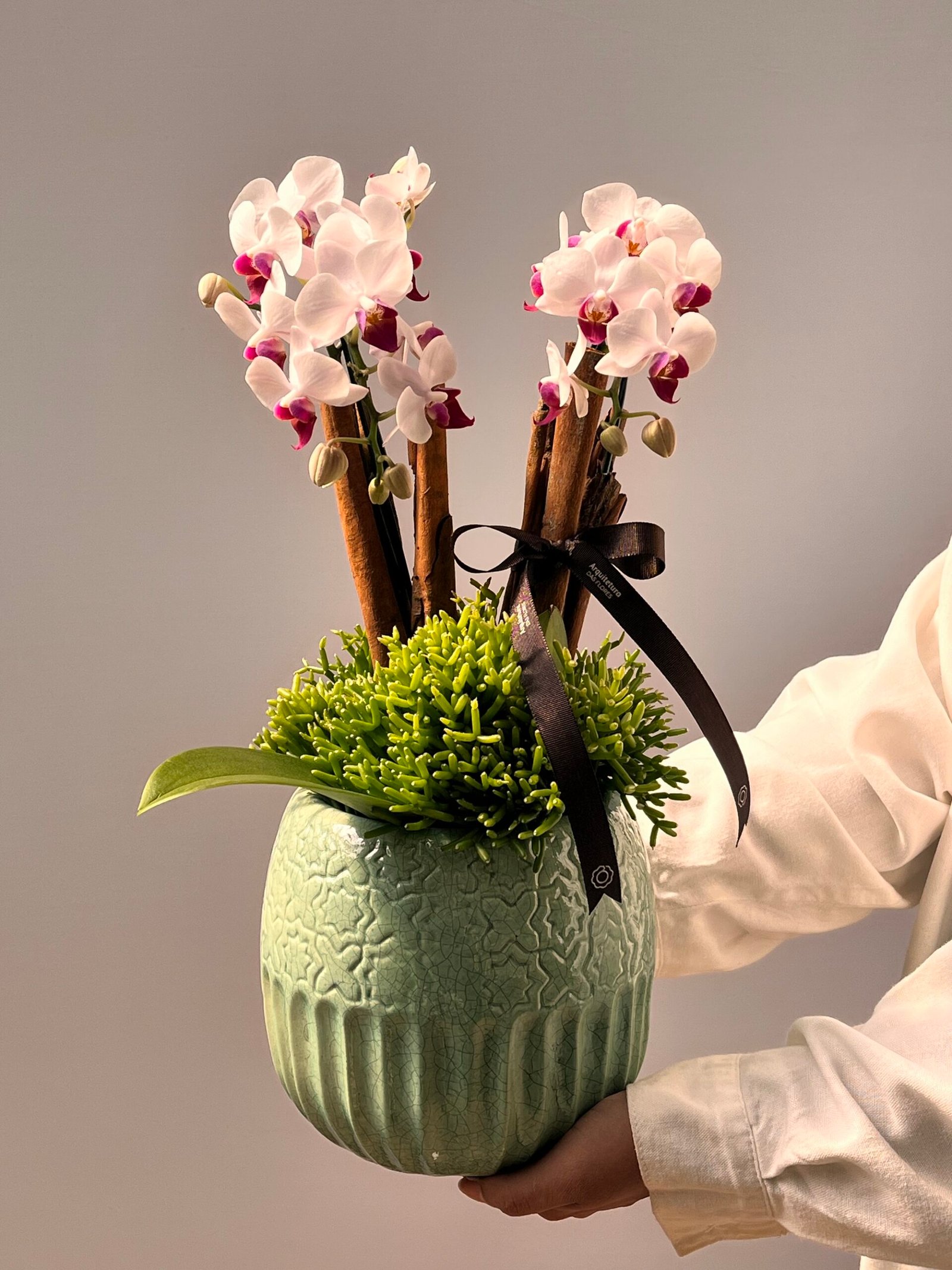 Mini Orquídea Phalaenopsis com 02 hastes, plantada em cachepô de cerâmica, adornada com Canelas e laço de gorgorão marrom.