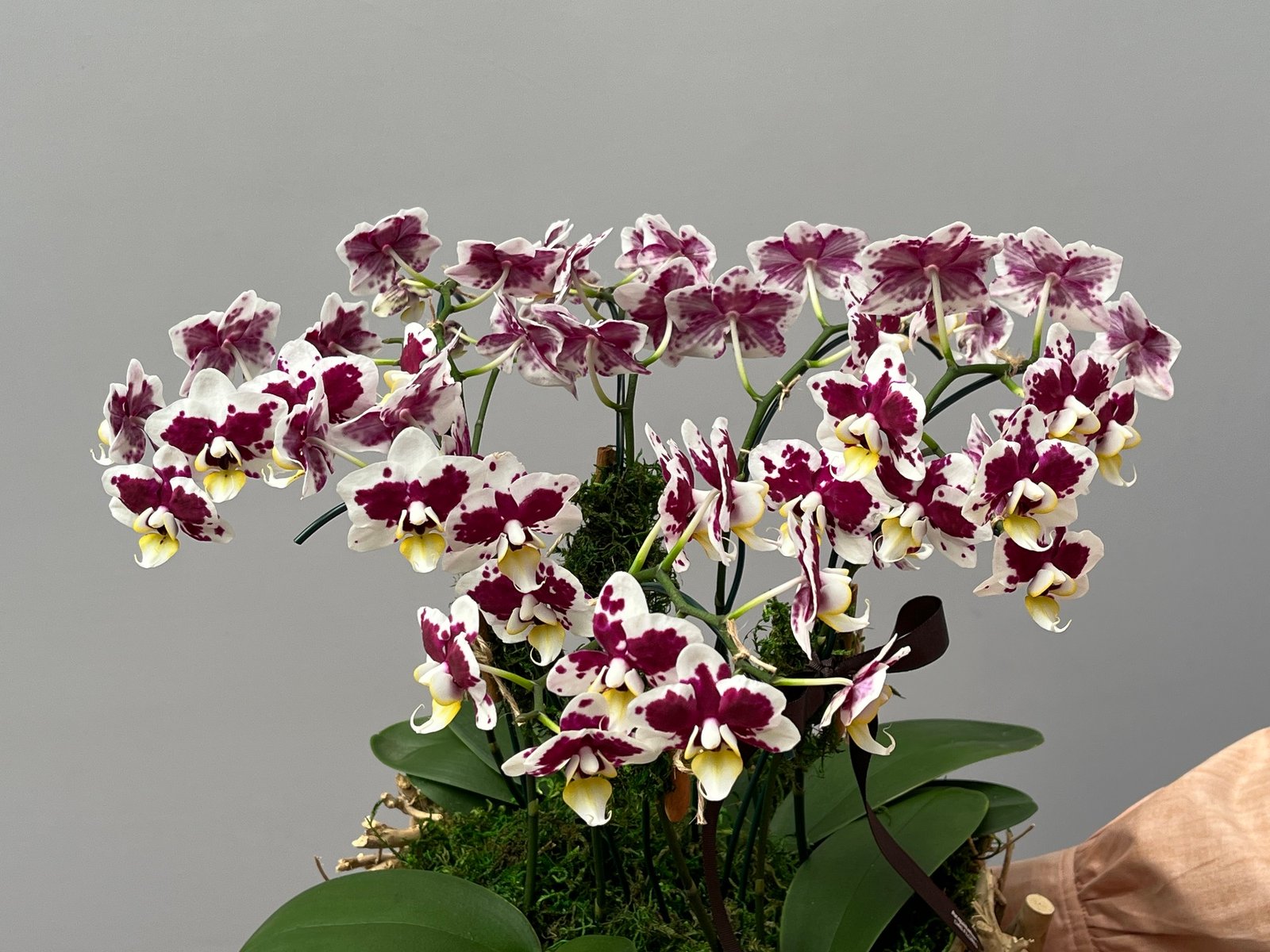 Arranjo com 08 hastes de mini orquídeas Phalaenopsis em tons de bordô e branco, elevando leveza sobre uma base construída com raízes naturais. A composição é finalizada com musgos desidratados, cascas de canela e fita de gorgorão, criando um encontro sutil entre o cuidado e a natureza.