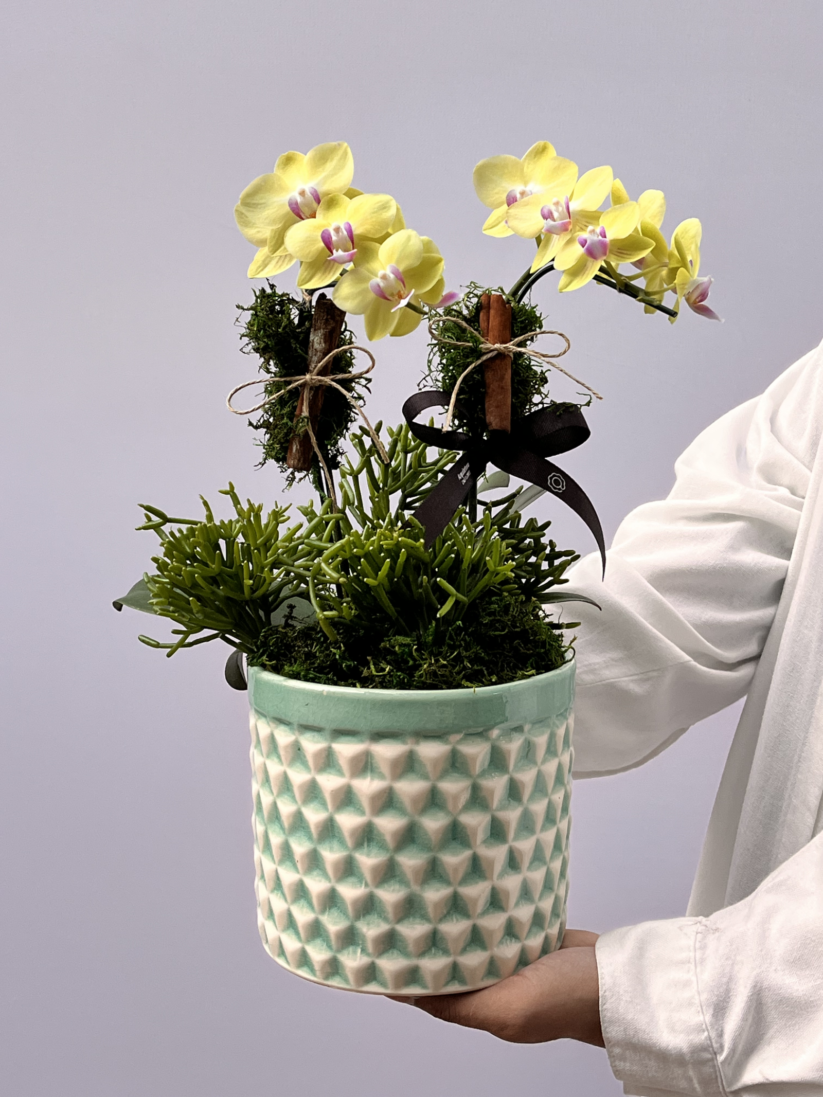 Mini Orquídea Phalaenopsis amarela mesclada em rosa, com duas hastes, plantada em cachepô de cerâmica e adornada com canelas e laço de gorgorão marrom.