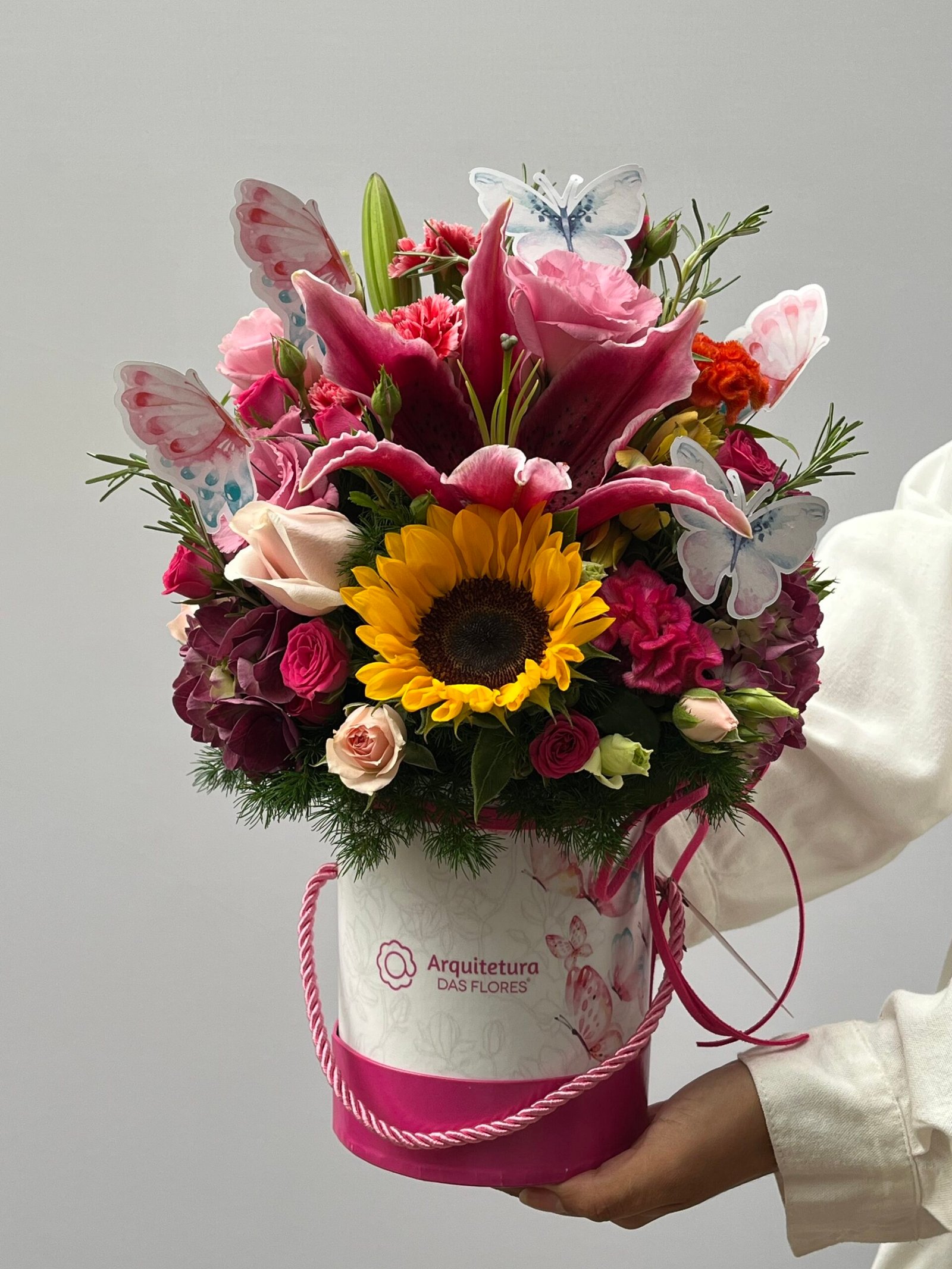 Por esse motivo, podem ocorrer sutis variações na quantidade, nas cores ou nos tamanhos das flores, singularidades que tornam cada arranjo único, como cada gesto de amor.