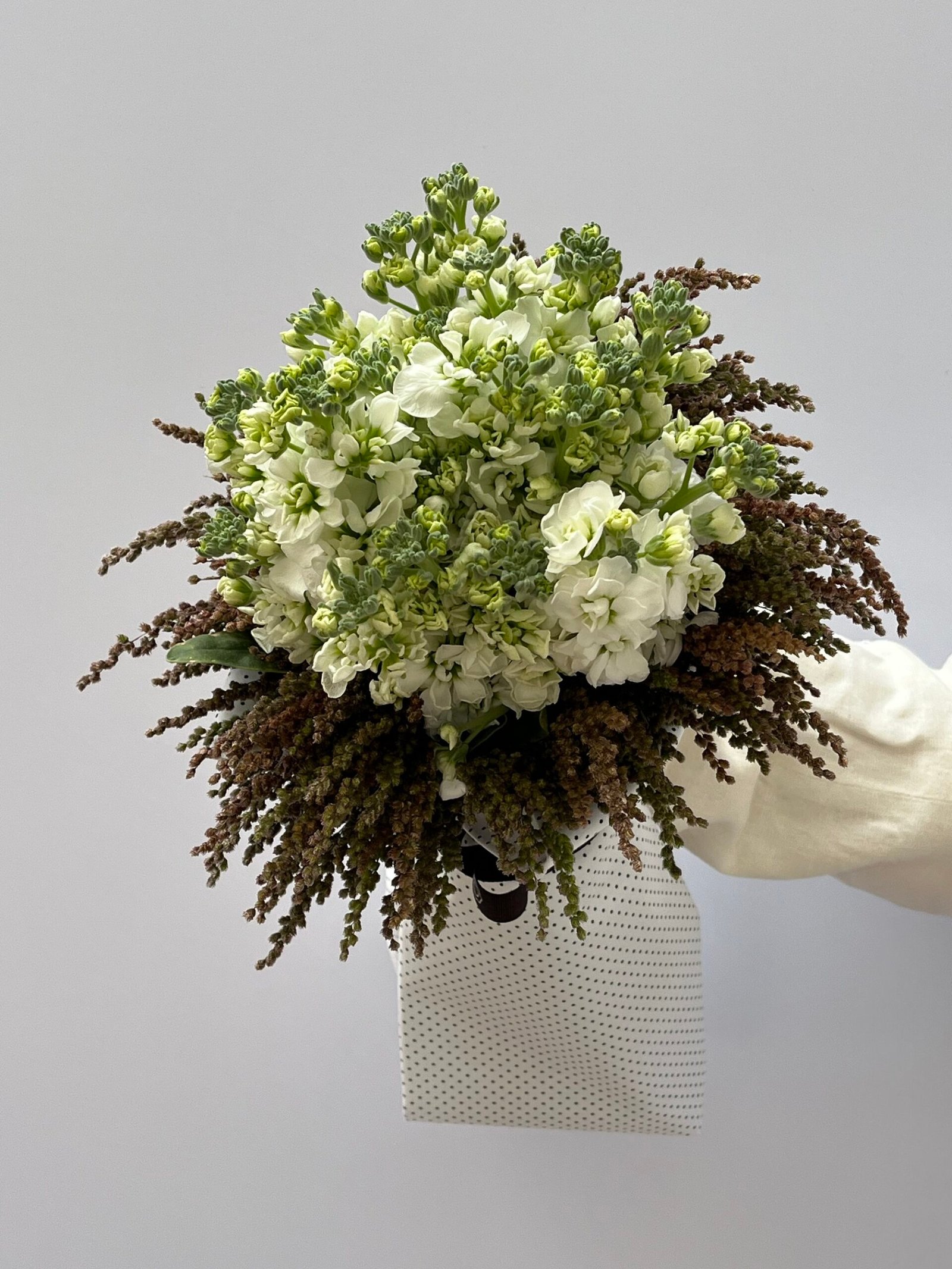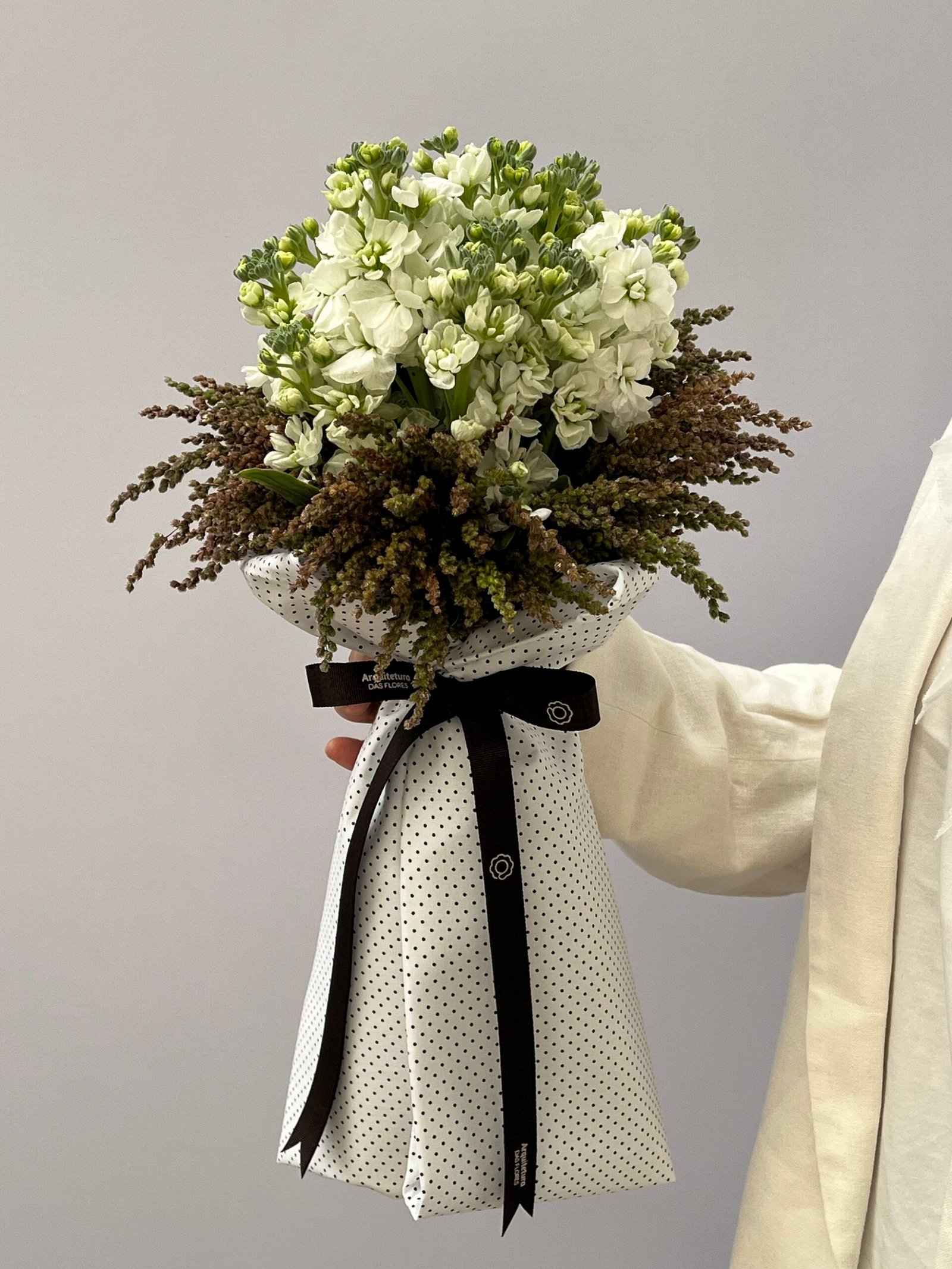 Goivos intensamente perfumados, rodeados por capins delicados, envolvidos em tecido branco com sutis detalhes em preto.