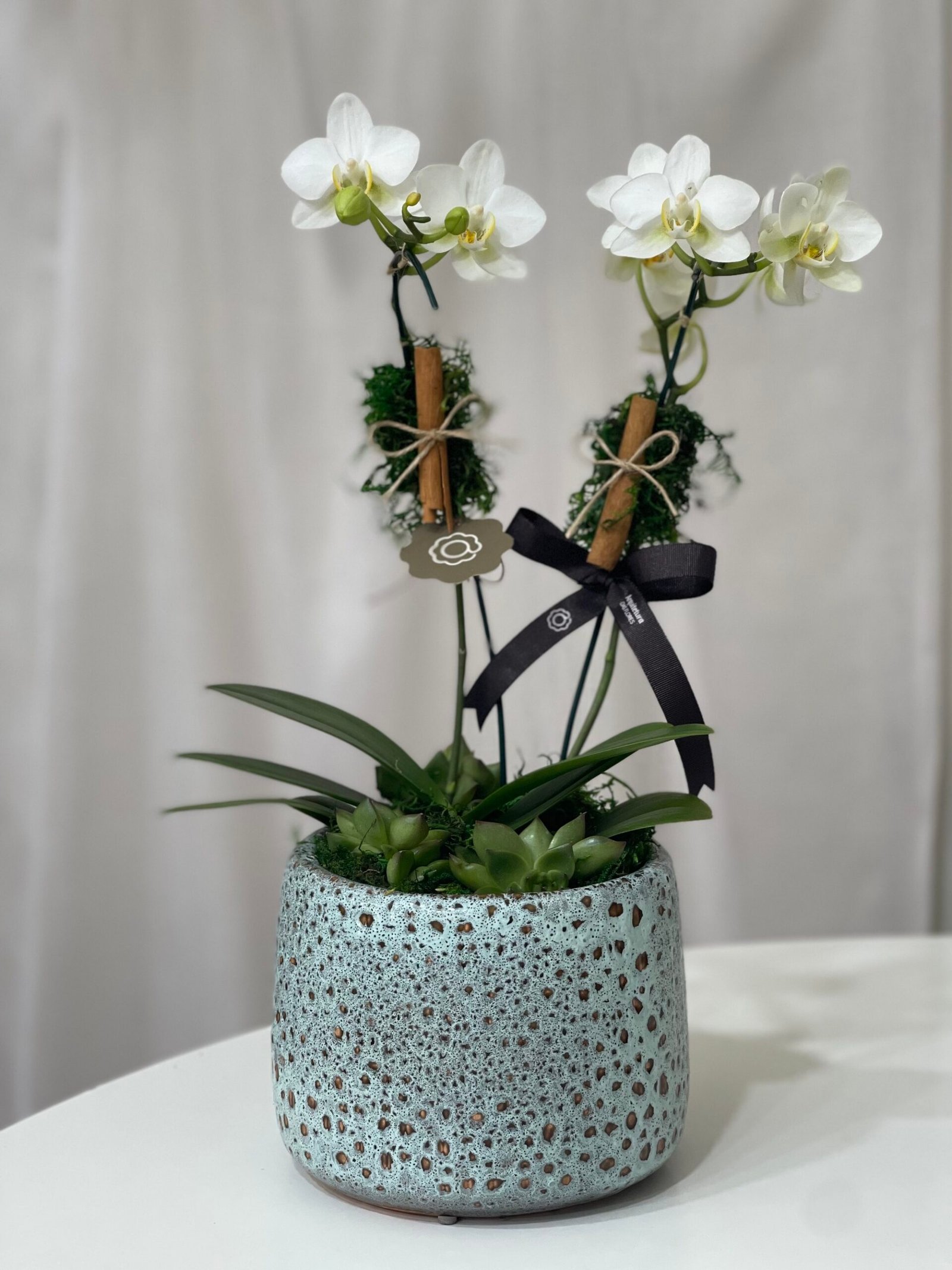 Mini orquídeas phalaenopsis brancas com duas hastes em vaso de cerâmica e musgo desidratado.