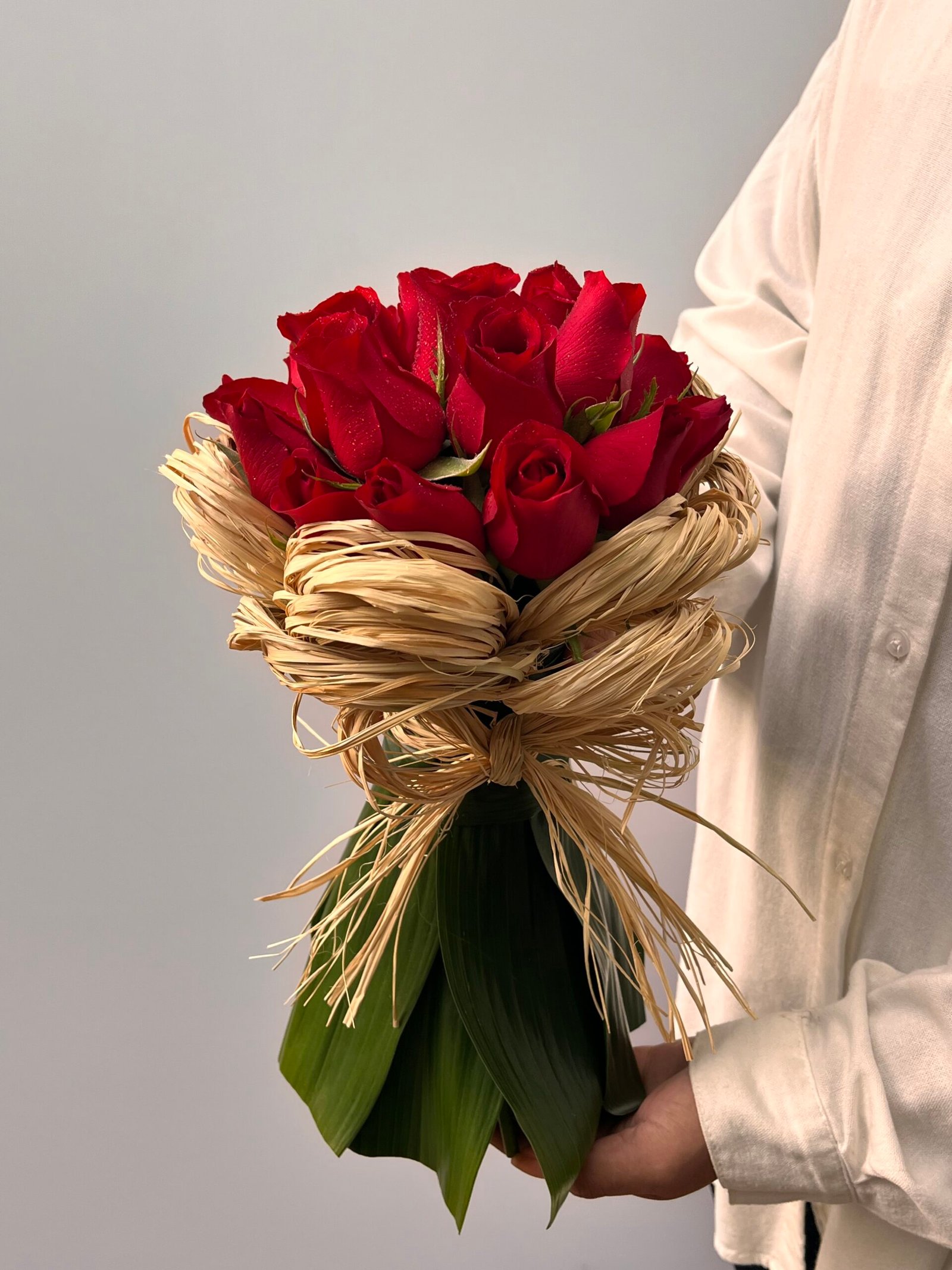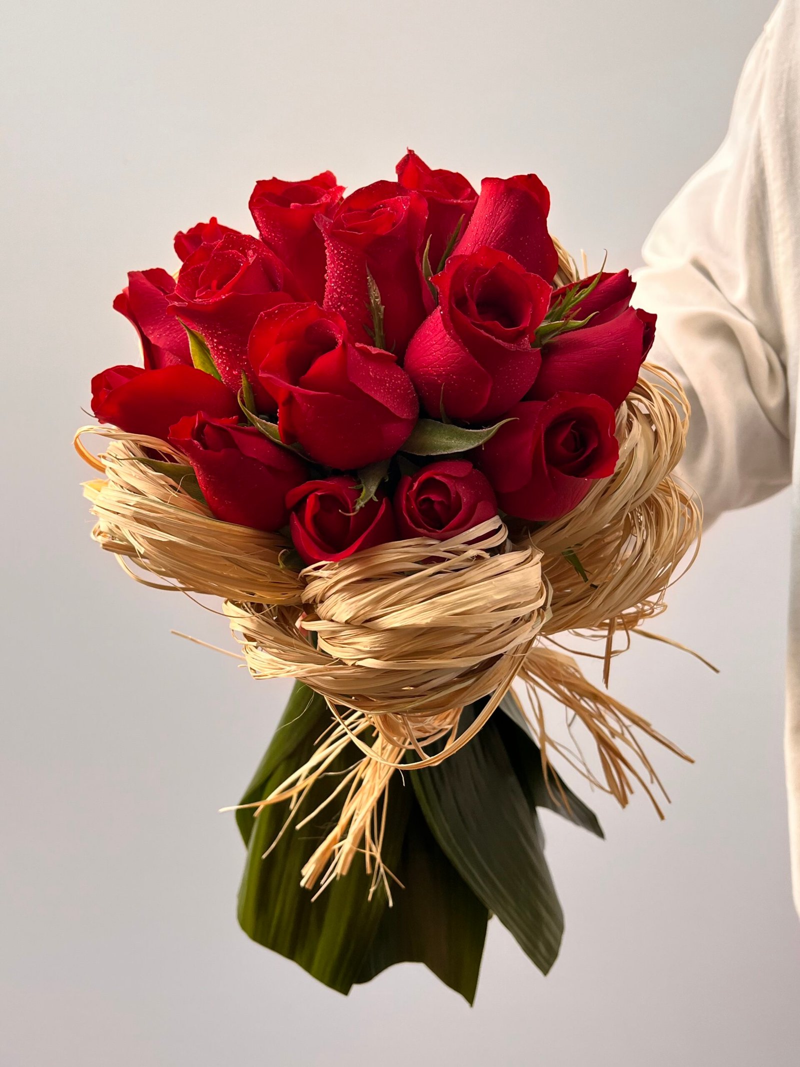 Buquê com 18 Rosas vermelhas e fios de ráfia.
